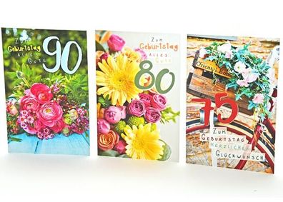 Zahlen-Geburtstagskarte 65-90 Jahre - 100 Stück - 3 Motive