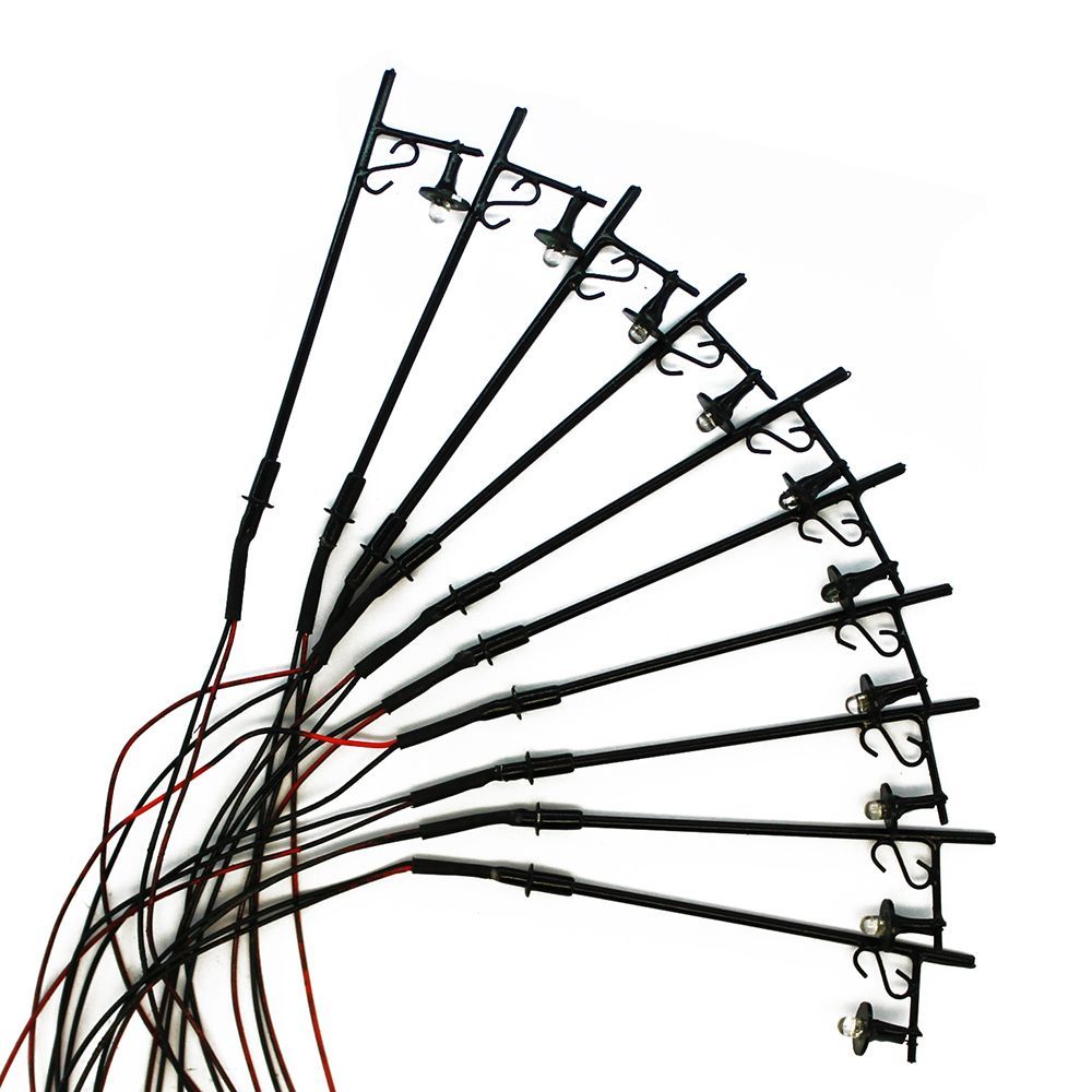 Zehn baugleiche H0 Lampen mit kleinen LED Leuchten.