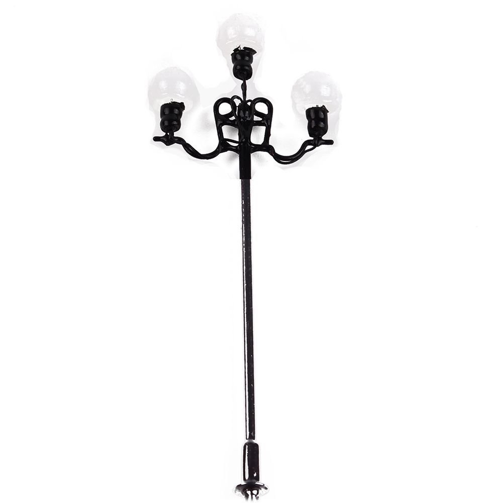10 identische Wechselstrom HO Modellbauzubehör in Form von dreiflammigen Laternen.