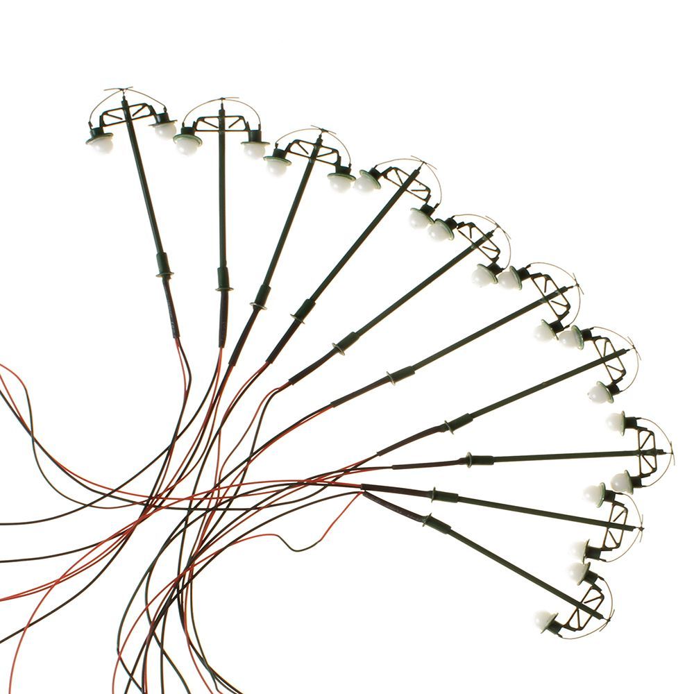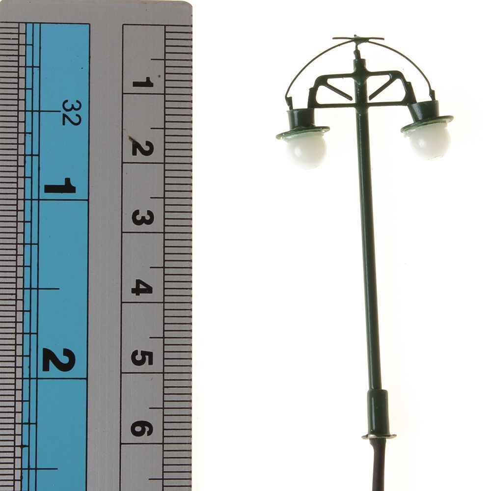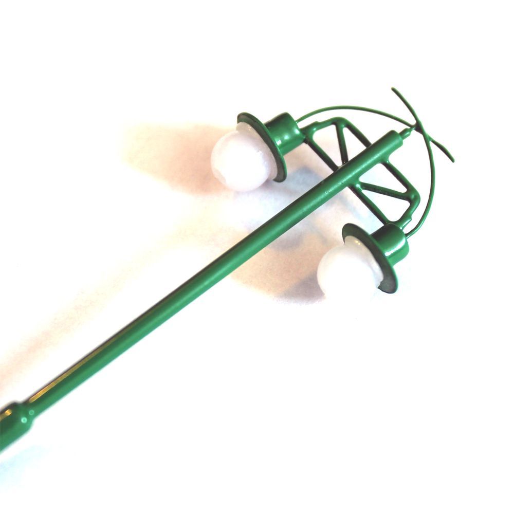 12 Volt AC Doppelflammige Lampen und Modellbau Zubehör im Maßstab 1:87. Grün Lackierte Lichtmasten und 55mm hohe H0 Maßstab Modellbau Laternen zum Ausleuchten von Straßen und Parkanlagen. 10 Stk. Landschaftsbau H0 Lichtmasten aus Metall.