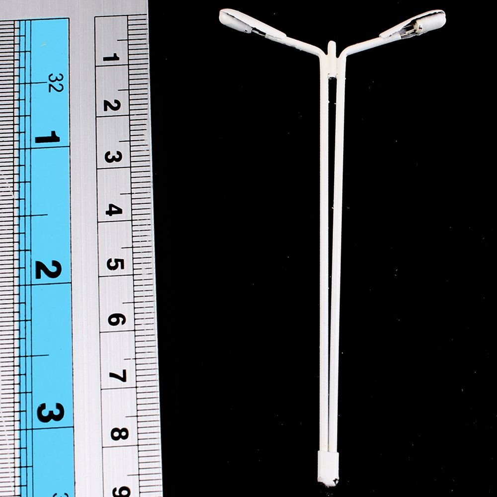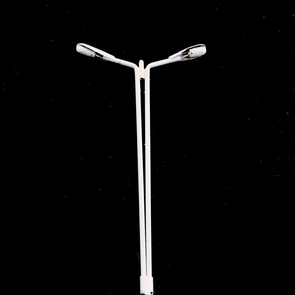Doppelflammige Straßenlaterne H0 Maßstab 1:87. 8,5cm hoher Lichtmast als Modelleisenbahn Licht und Miniatur Straßen-Beleuchtung für H0 Modellbahn Spurgrößen. Diese weißen Straßenlaternen eignen sich für 6 Volt Trafos und AC Stromkreise.