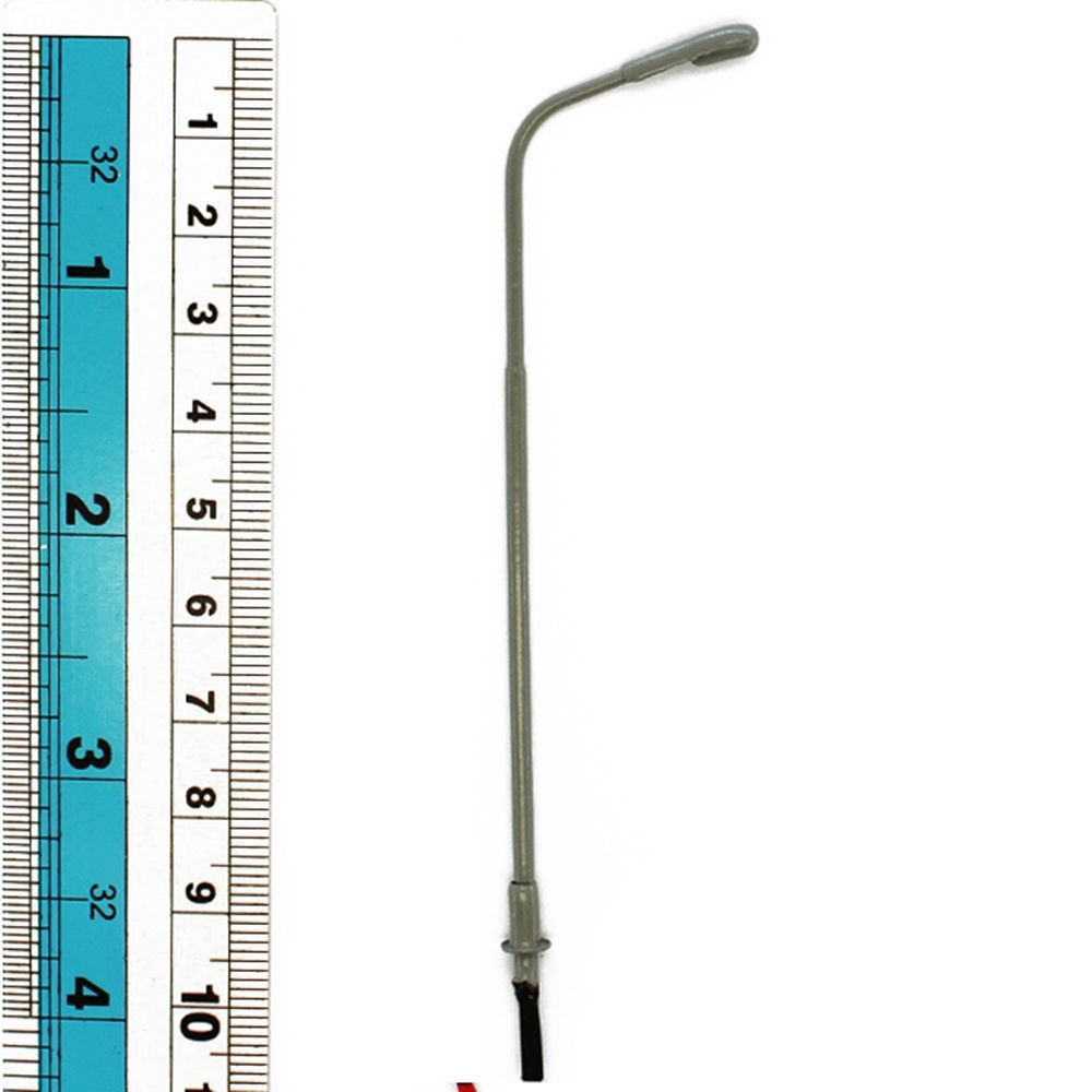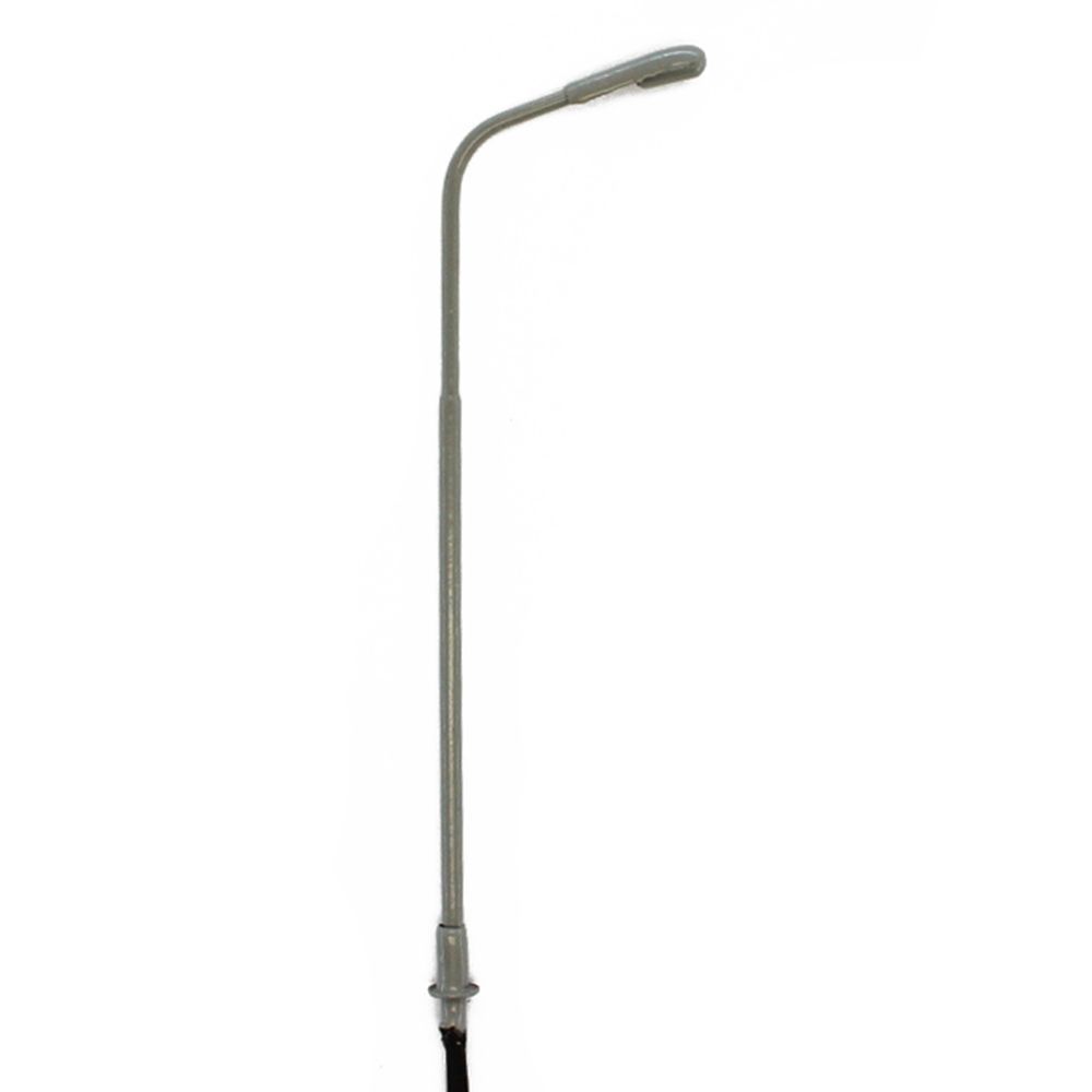 95 mm hohe Straßenlaterne. H0 Zubehör zum Ausleuchten von Modellbau Dioramen & Modellbahnanlagen im H0 Maßstab. 10 Stk. grau lackierte Led Peitschenleuchten aus Metall und mit abgesetzten Lichtmasten. LED Modellbau Leuchten für 3V DC Stromkreise.