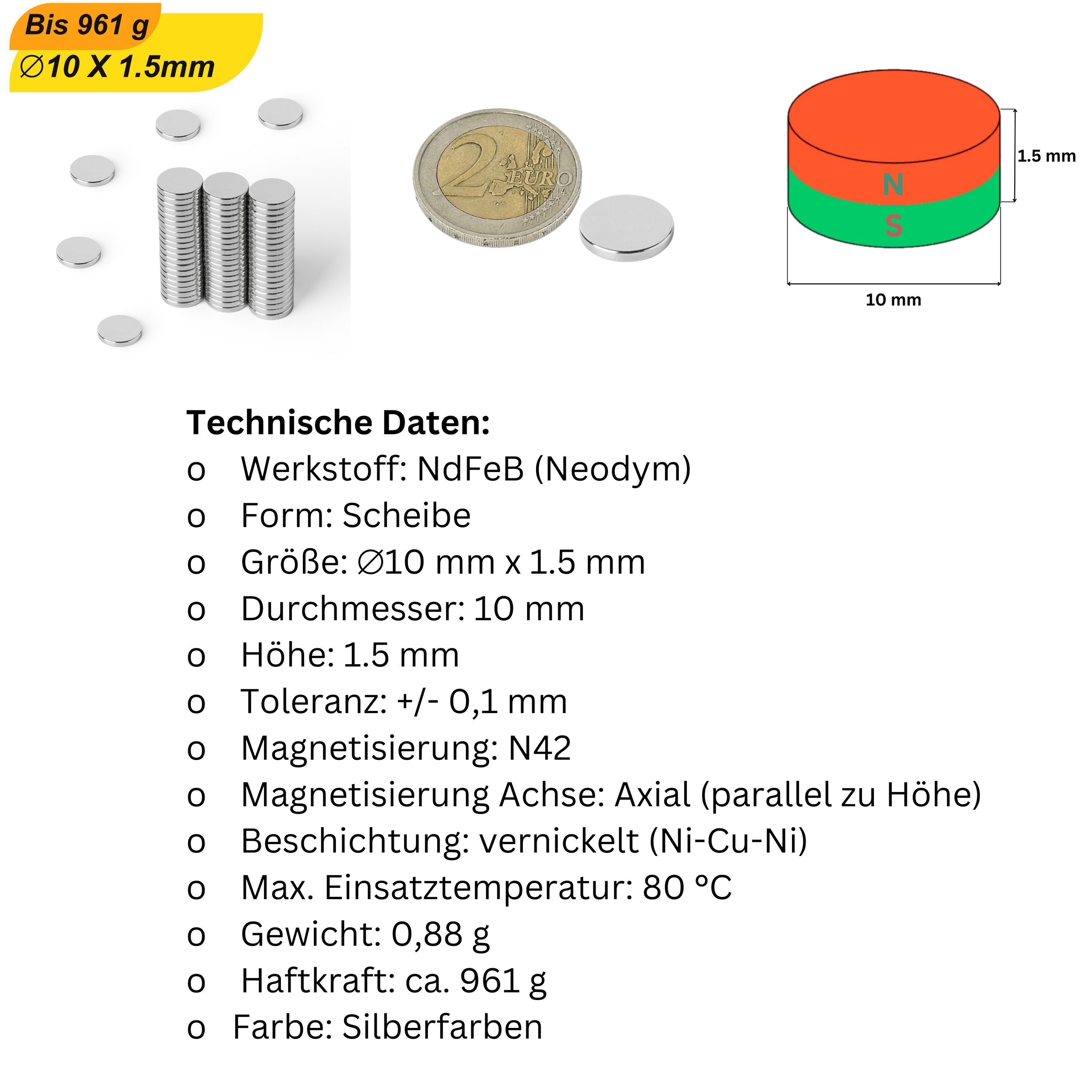 10 Stück Neodym Magnet Ø 10mm x 1,5mm - Starker Scheibenmagnet - N42 Supermagnet - Ho