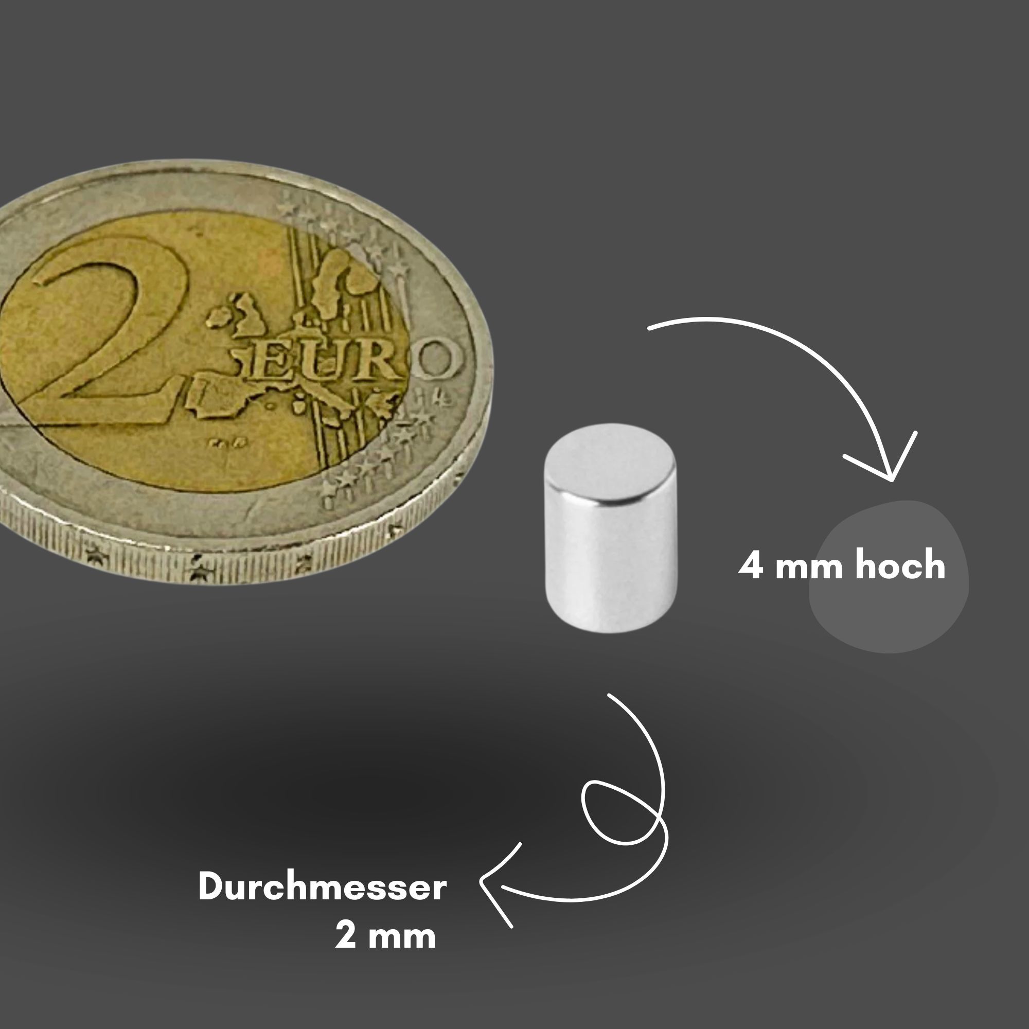 10 Stück Neodym Magnet Ø 2mm x 4mm - Starker Scheibenmagnet - N42 Supermagnet - Hohe