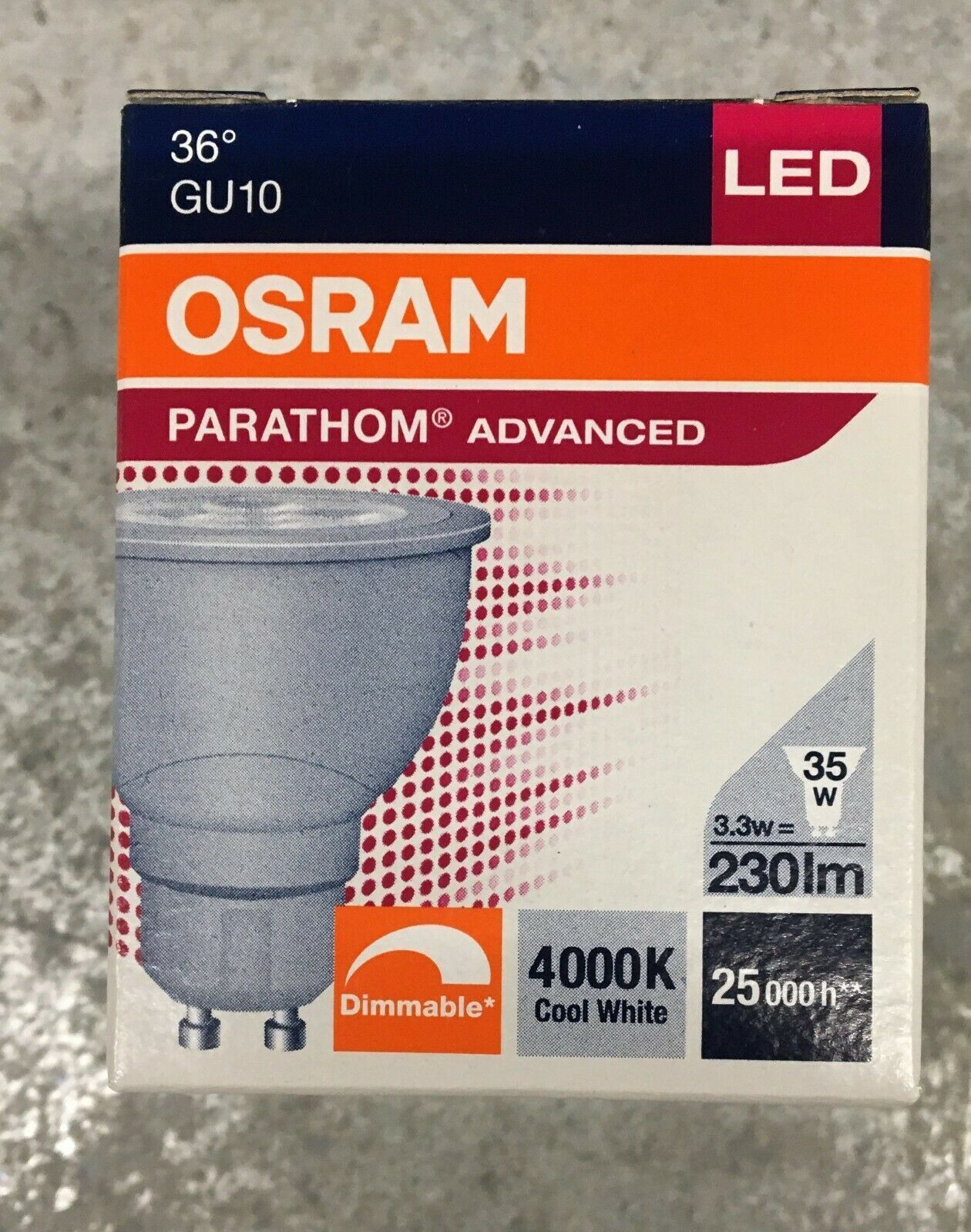 OSRAM 10 Stück Osram LED GU10 3,3W(35W) 840 230lm. 36G. Dimmbar 25000 Stunden EEK = A