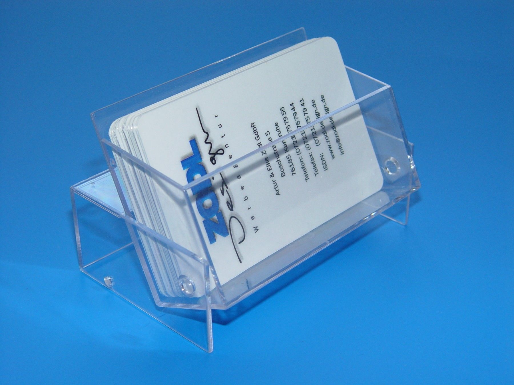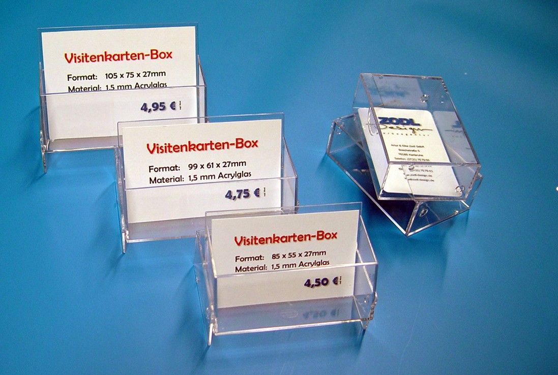 10 Stück VISITENKARTEN-BOX Querformat Objekt: Visitenkarten-Box für Tisch- und Theke, Visitenkarten bleiben auch beim Transport in der Box geschützt. Ausführung: aus stabilem transparenten Hart-PVC robust, unempfindlich, kratzfest Material: ca. 1,5 mm Acrylglas, glasklar Format: 105 mm x 75 mm x 27