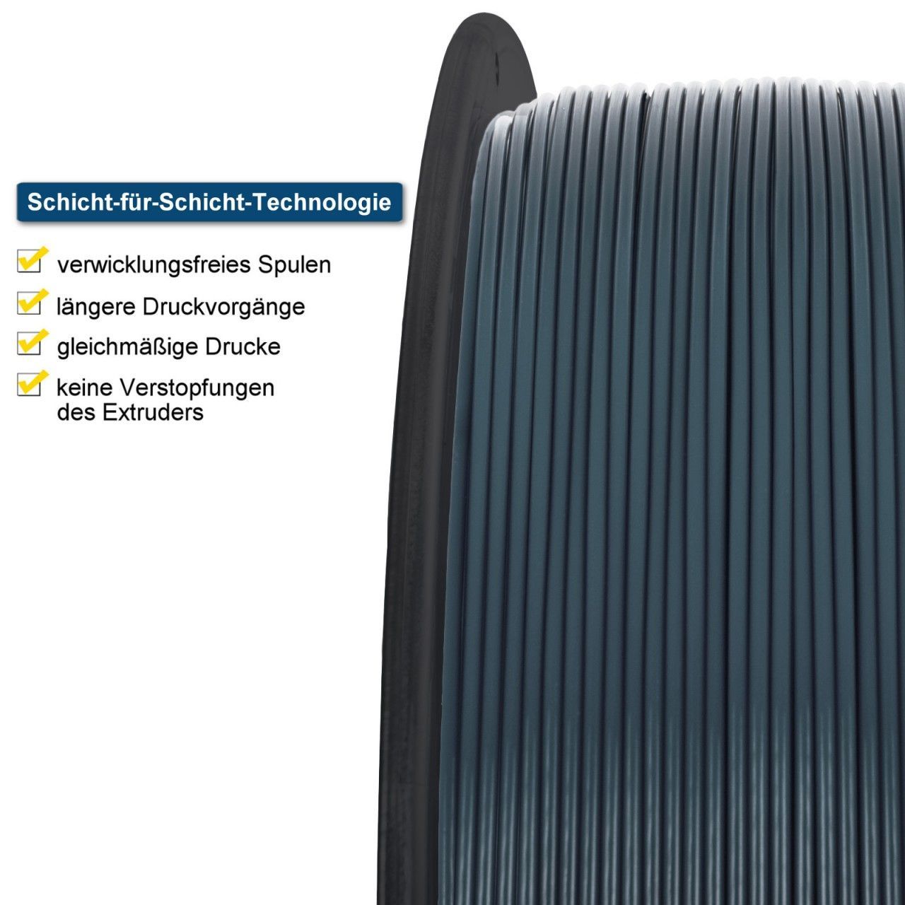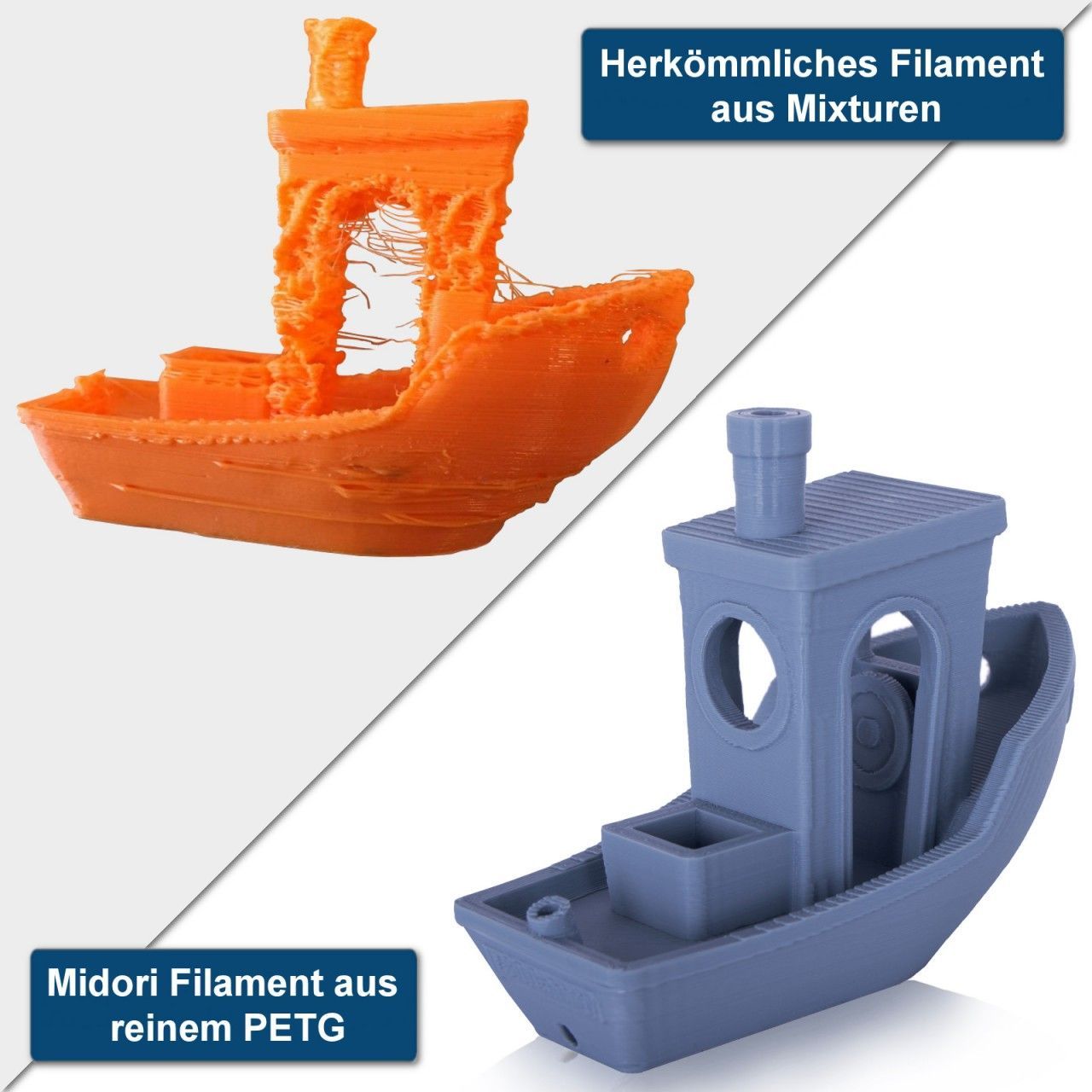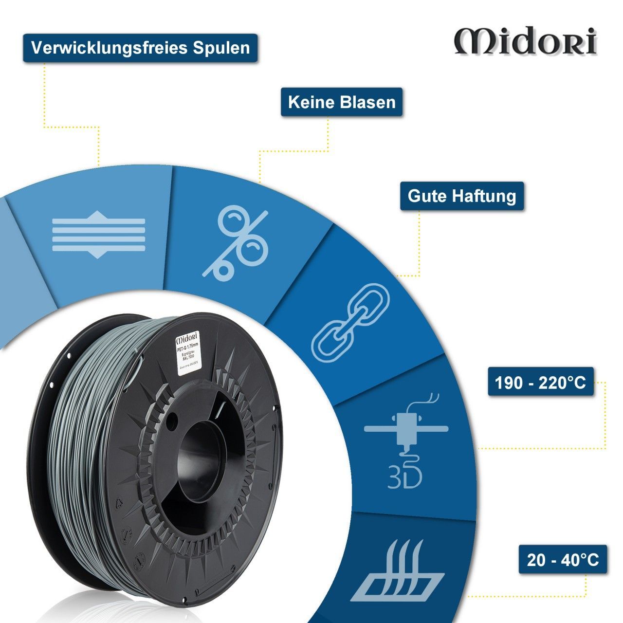 10 x MIDORI® 3D Drucker 1,75mm PETG Filament 1kg Spule Rolle Premium Signalgrau RAL7000 Midori Qualitätsfilamente Wir haben es mit unseren Midori Filamenten zur Aufgabe gemacht Ihnen ein qualitativ hochwertiges Filament und Sintermaterial anzubieten, das sich deutlich in den Eigenschaften der Rundheit, Maßhaltigkeit und Farbechtheit vom Markt abhebt, denn nichts ist bedauerlicher, als wenn ein Druckvorgang nach einigen Stunden Laufzeit aufgrund von schlechtem Material abbricht, oder sich Farben nicht reproduzierbar abbilden lassen. Qualitätsware für Qualitätsdrucke Unsere Midori 3D-Filamente zeichnen sich durch eine sauber gewickelte Spule, eine perfekte Rundheit, sowie umfassende Kompatibilität mit verschiedenen FDM-3D-Druckern und -Stiften aus. Somit profitieren Sie mit unseren Filamenten von reibungslosen Drucksitzungen, sowie hervorragenden Druckresultaten. Hervorragende Ergebnisse dank reinem PETG Unsere Midori PETG 3D-Filamente bestehen im Unterschied zu herkömmlichen PETG Konkurrenzprodukten aus reiner PETG (Polyethylenterephthalat mit Glykol). Die reine PETG hat gegenüber herkömmlichen Mixturen den Vorteil einer besseren Formgebung ohne Blasenbildung, Verstopfen oder Verziehen. Somit werden Ihnen glatte Ausdrucke mit hervorragender Schichthaftung und hoher Steifigkeit ermöglicht. Verwicklungsfreies Spulen für glatte Druckabläufe Die hochwertigen Midori 3D-Filamente bewerkstelligen dank ihrer Schicht-für-Schicht-Technologie ein verwicklungsfreies Spulen und saubere Windungen, sodass längere Drucke problemlos ohne Verknotungen, Kreuzungen oder Überlappungen bewältigt werden können. Dadurch werden nicht nur extrem gleichmäßige Drucke sichergestellt, sondern auch mögliche Verstopfungen im Extruder verhindert. Konstanter Durchmesser in jedem Zentimeter Mit unseren 1,75 mm PETG 3D-Filamenten setzen wir auf höchste Präzision im gesamten Produktionsprozess. Die Herstellung der Filamente erfolgt unter strengsten Prüfungsmechanismen, sodass der Durchmesser der hochwertigen Filamente in jedem Zentimeter eine Toleranz von nur +/- 0,05 mm aufweist. Der daraus entstehende nahezu konstante Filament-Durchmesser verhindert Verstauungen und sorgt für ein reibungsloses Drucken ohne Unterbrechungen, woraus beim Drucken eine minimale Schrumpfung, stärkere Schichthaftung, sowie eine glattere Oberfläche resultieren. PETG - Das zuverlässige Material für den Außenbereich Die Midori PETG 3D-Filamente werden aus mit Glykol modifiziertem PET (Polyethylenterephthalat) gefertigt. Das in den Filamenten enthaltene Glykol hat niederviskose Eigenschaften, die den Druckprozess schneller und einfacher ablaufen lassen. Bei dem zugleich zähen, elastischen und extrem bruchfesten PETG Filamenten handelt es sich um einen insgesamt zuverlässigen Kunststoff, der im Vergleich zu PLA und ABS witterungsbeständig ist und sich somit auch für den Außenbereich eignet. Außerdem bringt PETG den Vorteil mit sich, dass diese im Unterschied zu anderen Kunststoffen völlig geruchsneutral ist. Optimaler Schutz & ideale Lagerbedingungen dank sicherer Verpackung Unsere Midori 3D-Filamente sind auf extrem hochwertigen transparenten Spulen gewickelt, die anders als herkömmliche minderwertige Spulen für optimale Druckresultate auch beheizt werden können. Jede Spule ist mit Informationen über die Materialart, die Farbe (gegebenenfalls mit Angabe der RAL-Nummer), den Durchmesser und die Drucktemperatur versehen. Zum Schutz vor Staub und Fremdstoffen werden die Midori 3D-Filamente anders als herkömmliche Konkurrenzfilamente mit einem Feuchtigkeitsschutz-Beutel in einer wiederverschließbaren feuchtigkeits- und lichtundurchlässigen Aluminiumpackung vakuumversiegelt, womit optimale Lagerbedingungen geschaffen werden. Damit der optimale Zustand der Filamente bei ihrer Ankunft sichergestellt werden kann, werden die Spulen jeweils in eingeschweißten Umkartons verpackt. Weite Kompatibilität mit vielen FDM-3D-Druckern & -Stiften Die 1,75 mm Midori PETG 3D-Filamente sind universell entwickelt worden und weisen eine breite Kompatibilität mit den meisten FDM-3D-Druckern und -Stiften für 1,75 mm Filamente auf. Technische Daten Marke: Midori Material: PETG (Polyethylenterephthalat) Drahtstärke: 1,75 mm Maßgenauigkeit: +/- 0,05 mm Inhalt: 1.000 g Länge: 340 m Farbe: Orange (RAL2000) Empfohlene Drucktemperatur: 230 - 255°C Empfohlene Druckbetttemperatur: 70 - 80°C Spulendurchmesser: 200 mm Spulenbreite: 68 mm Spulennabenlochdurchmesser: 53 mm Spulenbruttogewicht: 1,25 kg Weitere Produktdaten Materialdichte: 1,27 g/cm³ Schmelzflussrate: 11 g/10 min (210°C, 2,16 kg) Zugdehnung: 18% Gekerbter Izod-Aufprall: 11 kJ/m² Zugfestigkeit: 48 MPa Wärmeformbeständigkeitstemperatur (HDT): 70°C Glasübergangstemperatur: 85°C Vorschlag zur Druckgeschwindigkeit: 30 - 120 mm/s Gewicht einer leeren Spule: 0,25 kg