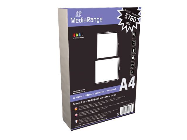 für alle CD-Jewelcases weiß matt wasserresistent vorperforiert Maße Booklet: 121 x 120mm Maße Inlay: 151 x 118mm für alle gängigen Tintenstrahldrucker geeignet bis zu 5760dpi 50 Einleger pro Pack
