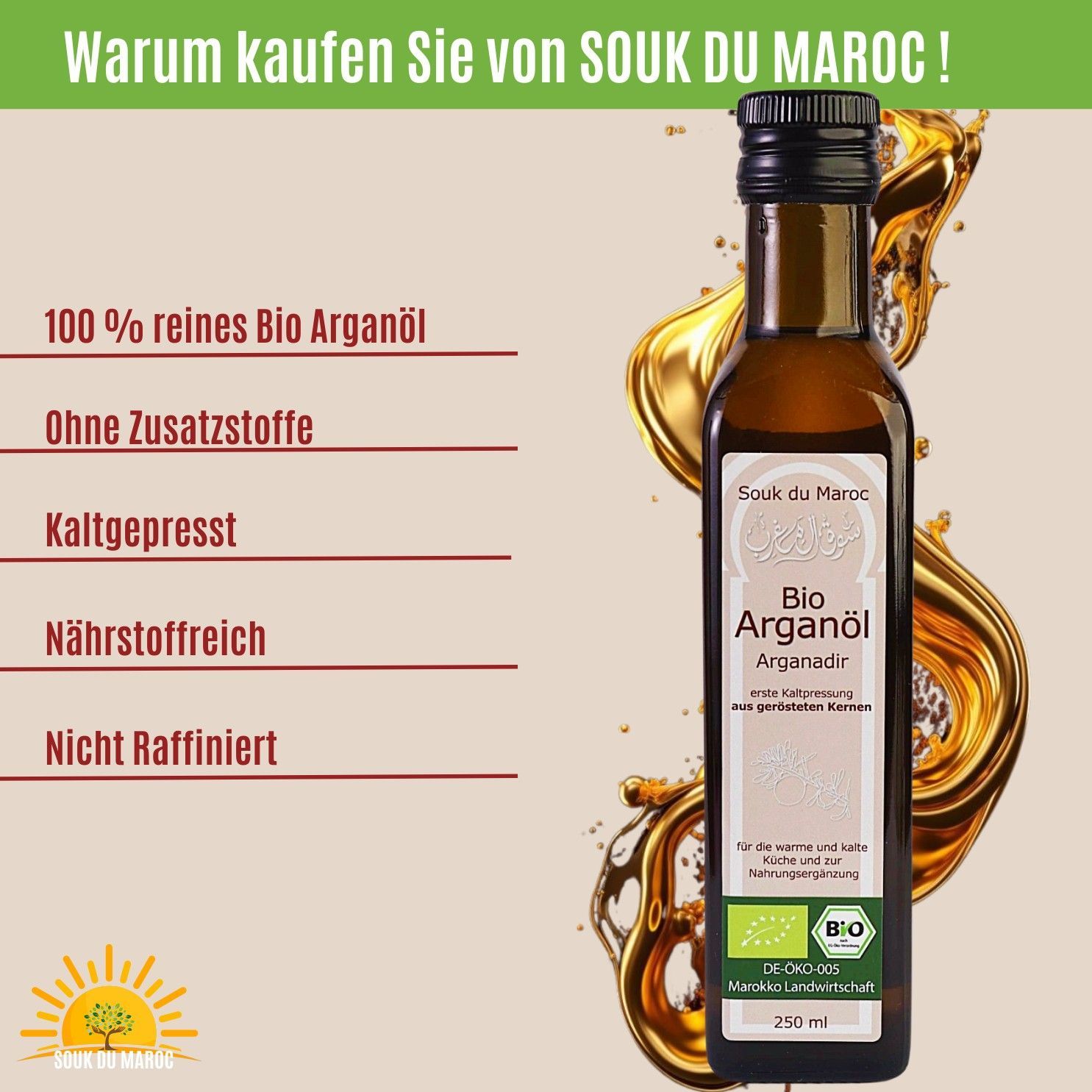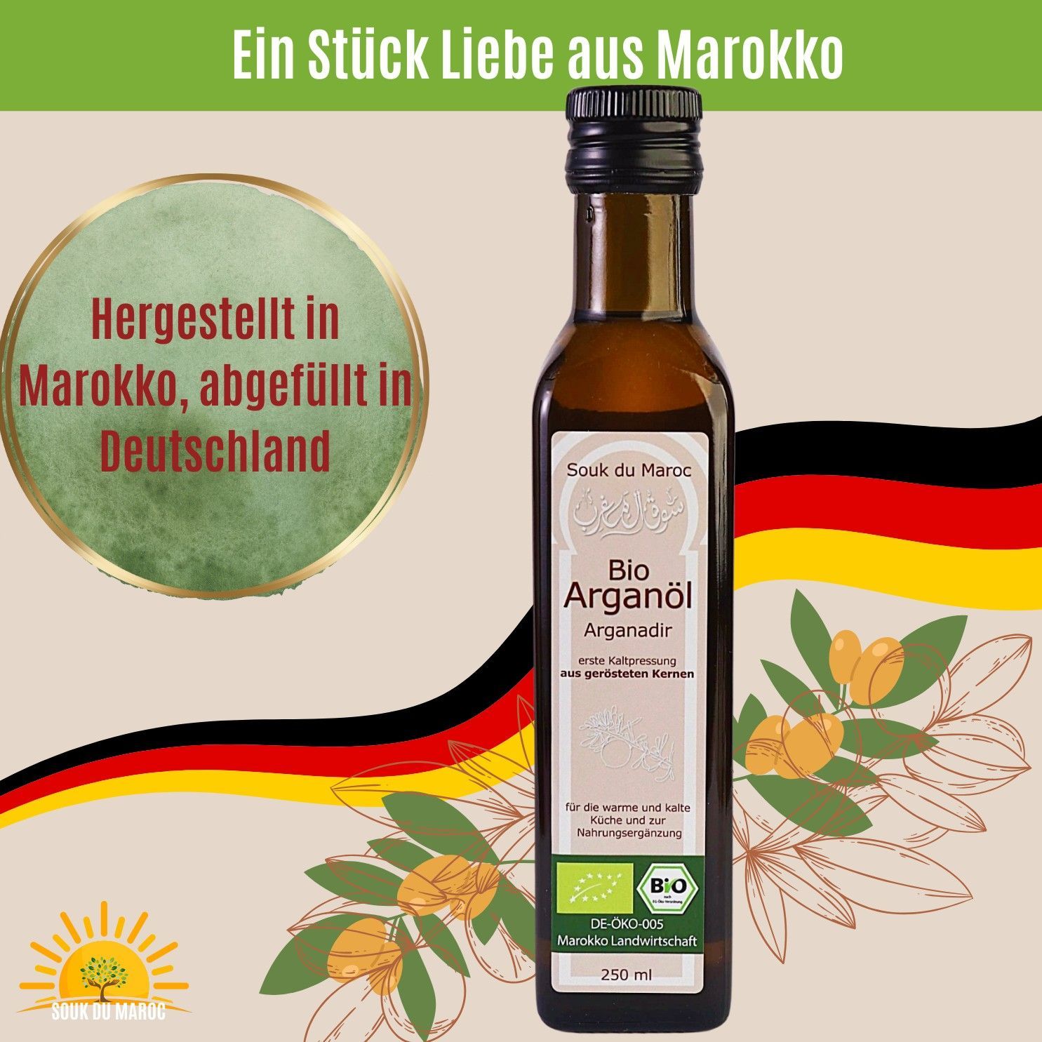 100% Bio Argan-Speise-Öl | geröstet | kaltgepresst und Rein | 250ml mit Ausguss