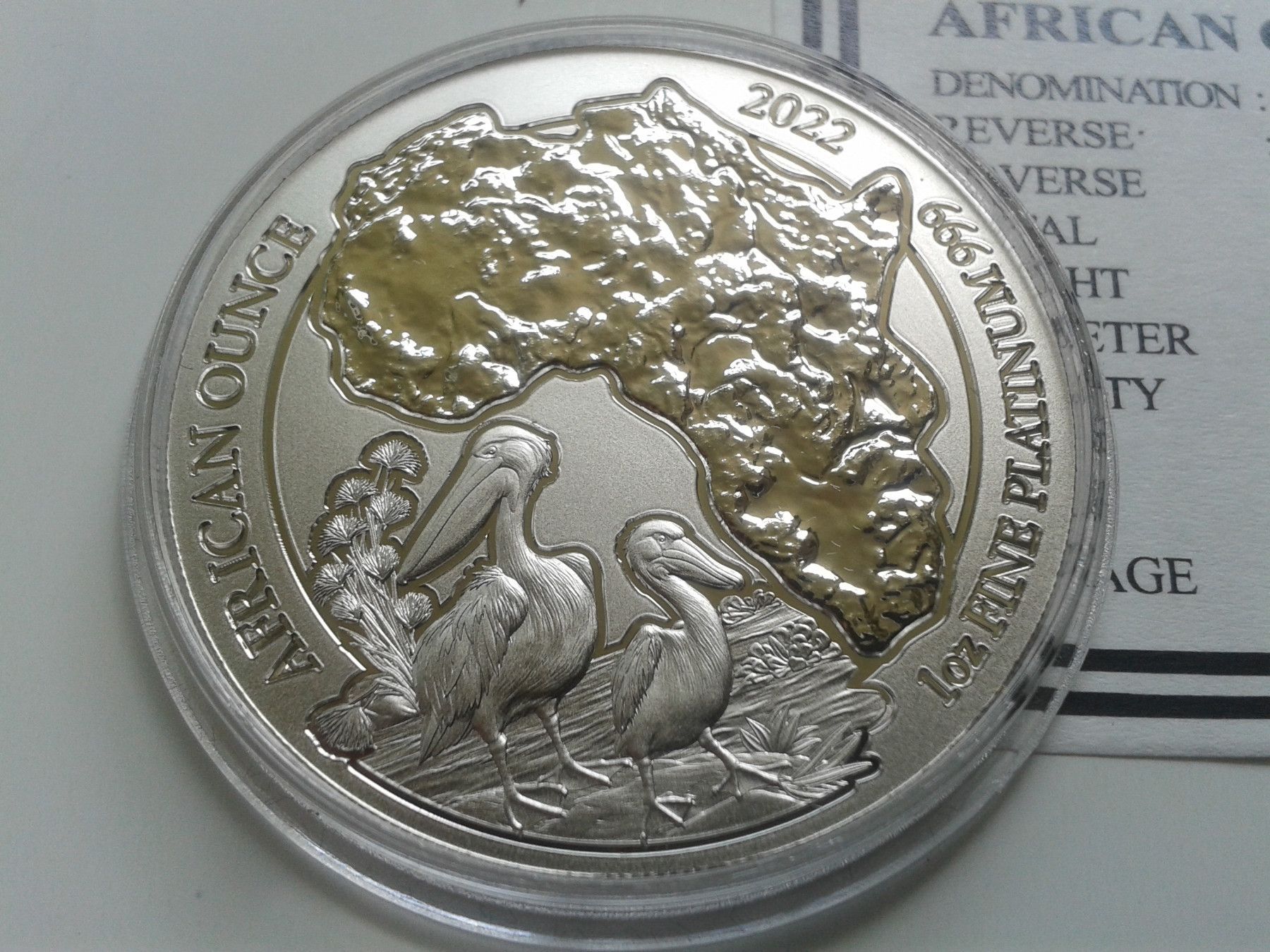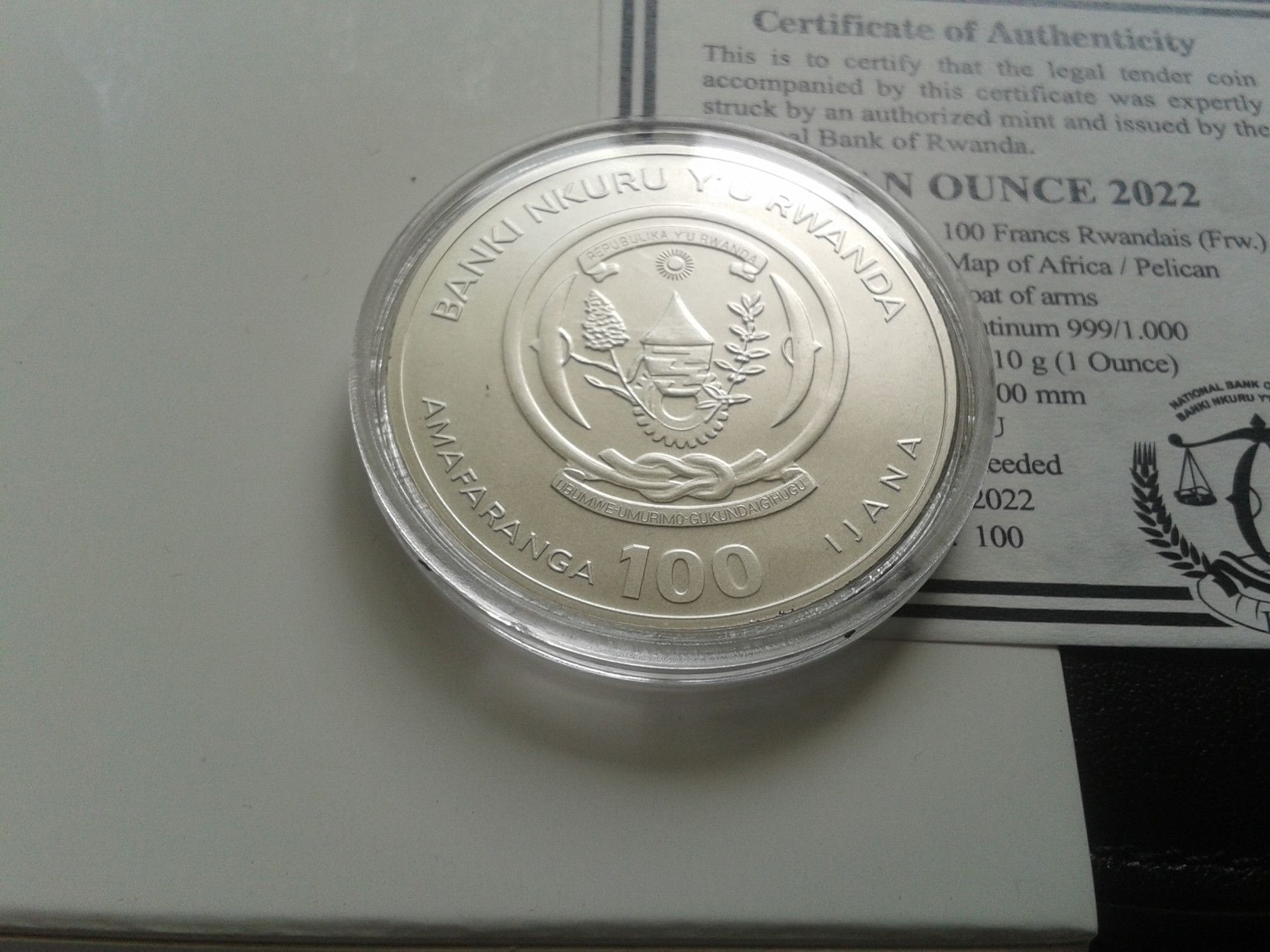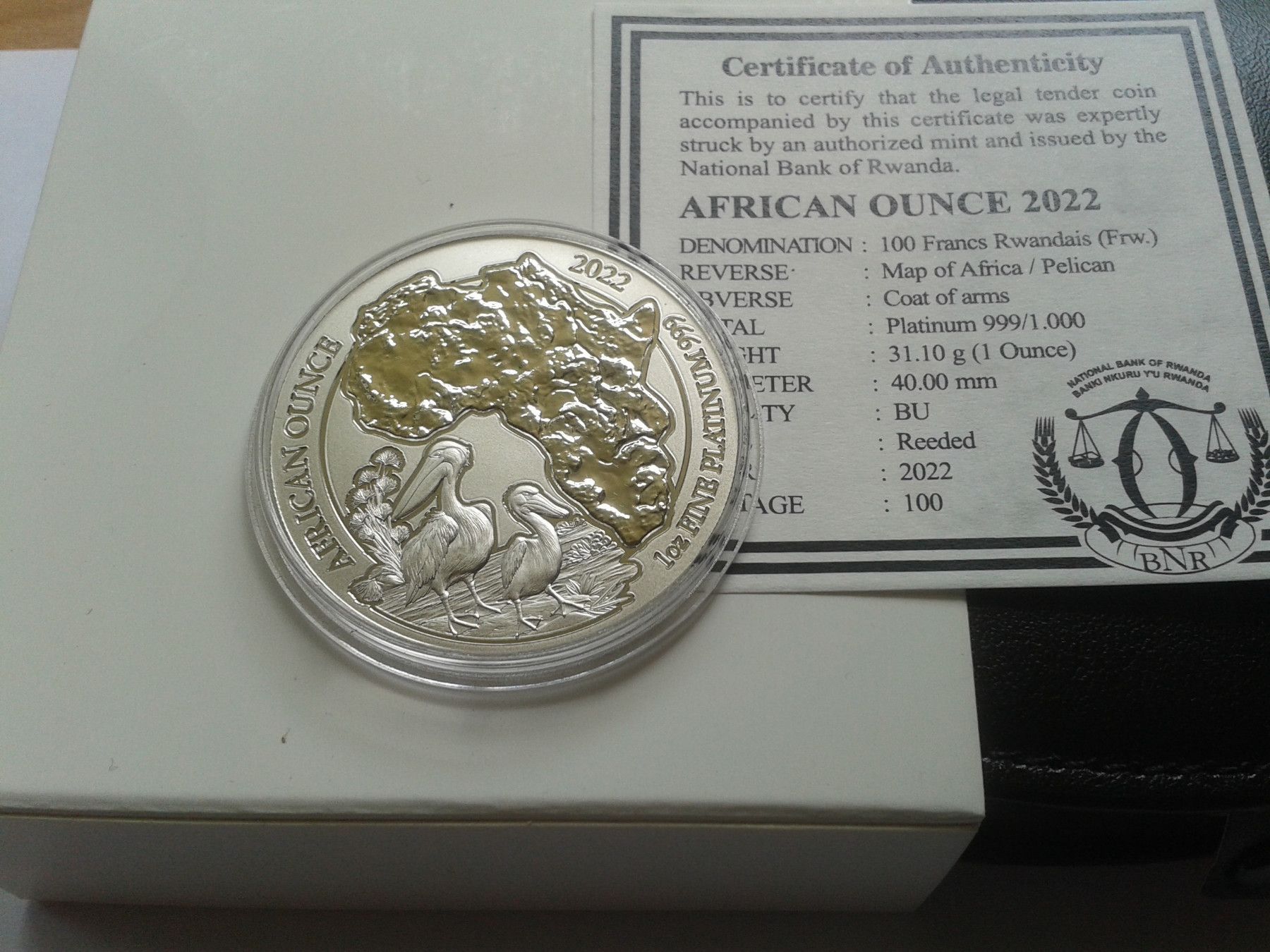 100 Francs 2022 Ruanda Pelikan 1 Unze Platin 31,1g 999er Platin nur 100 Stück geprägt