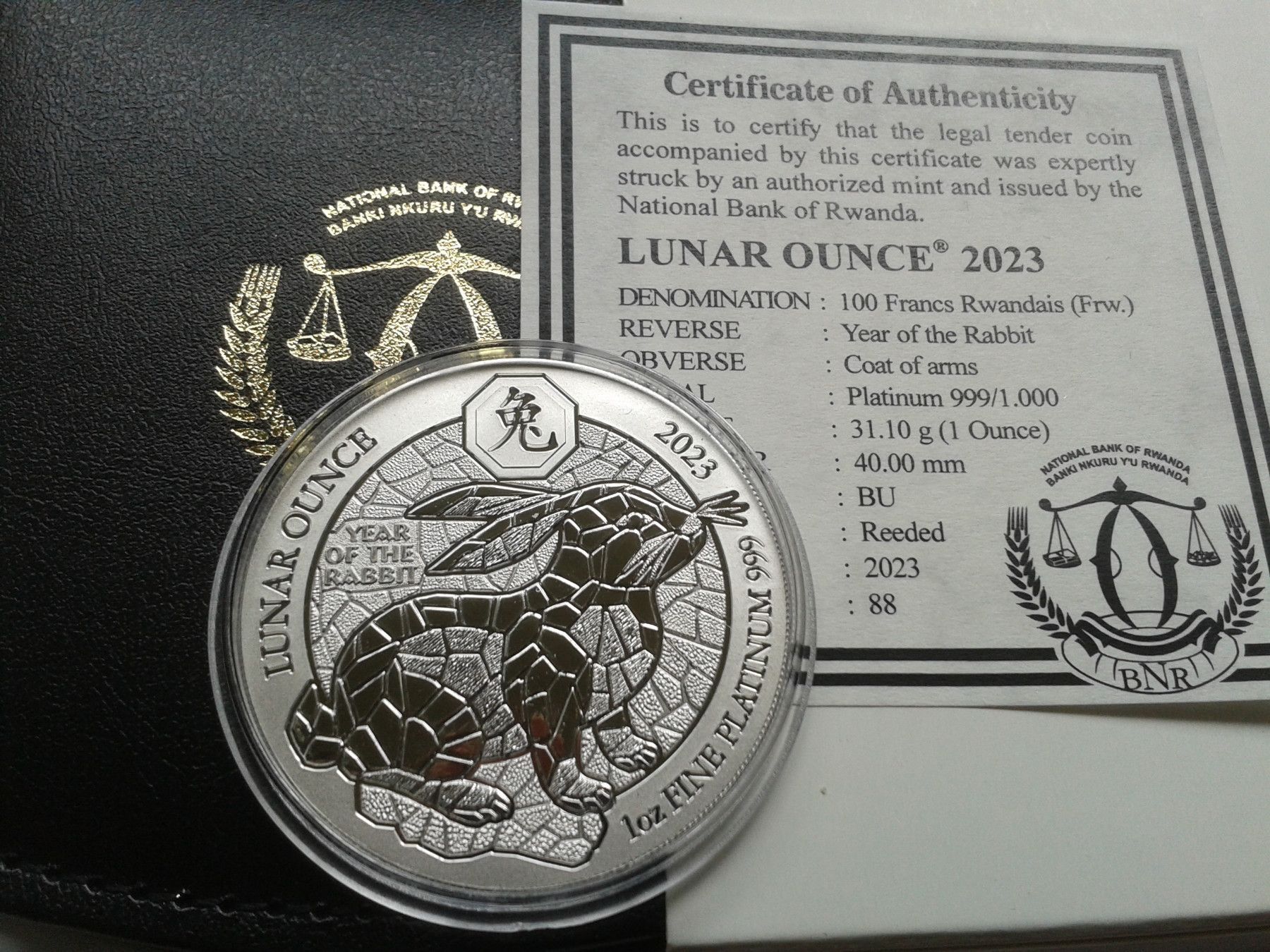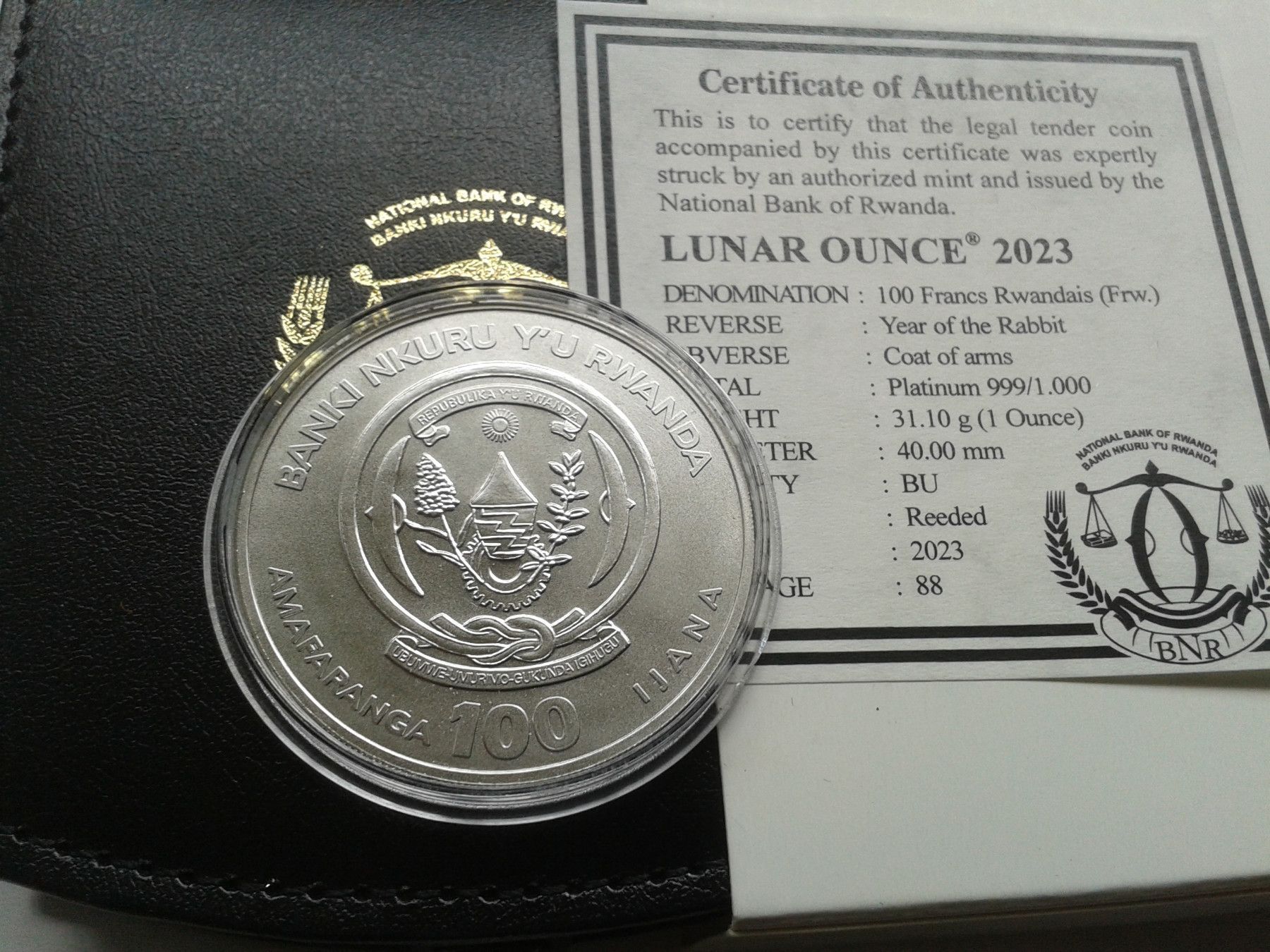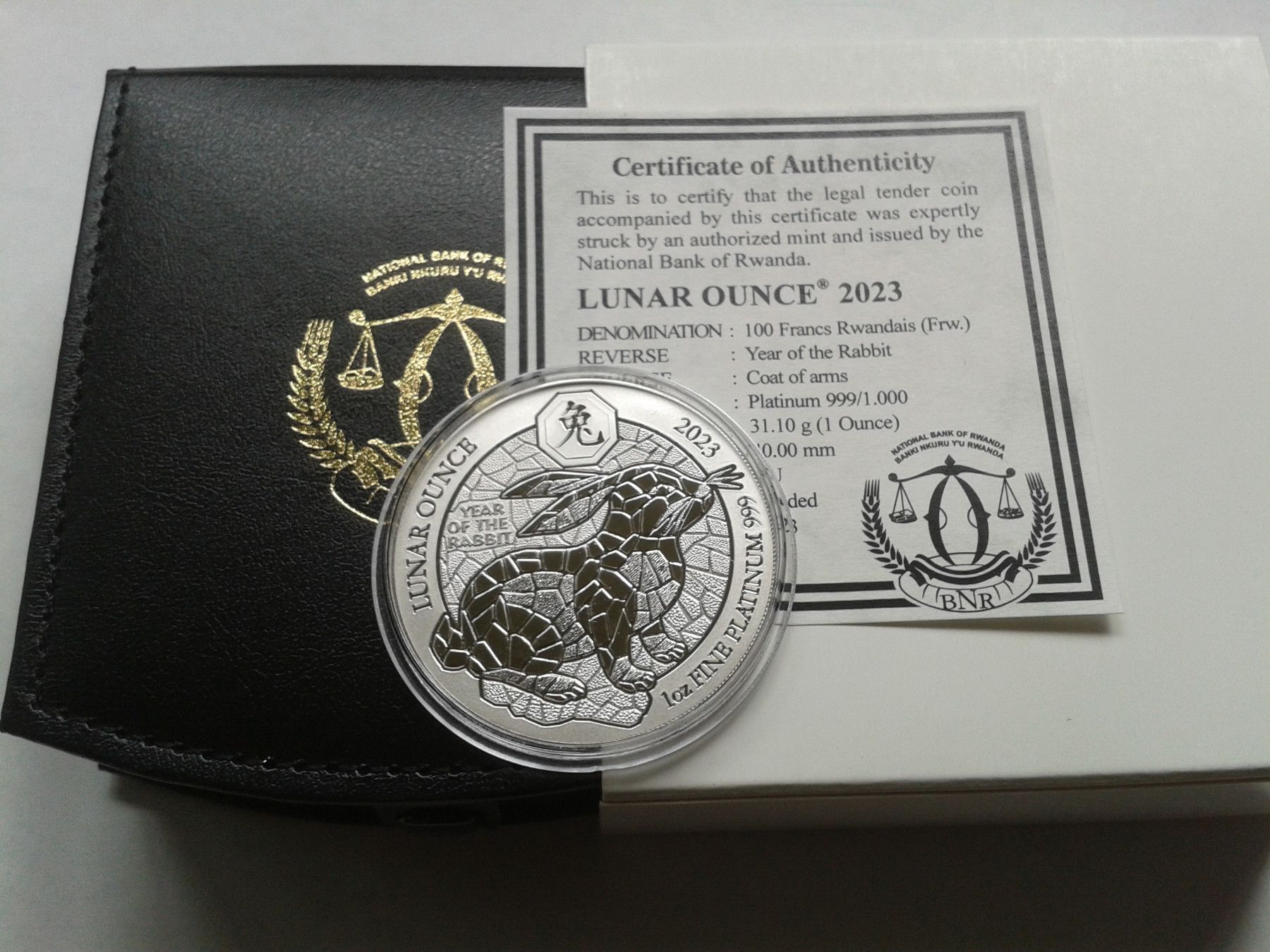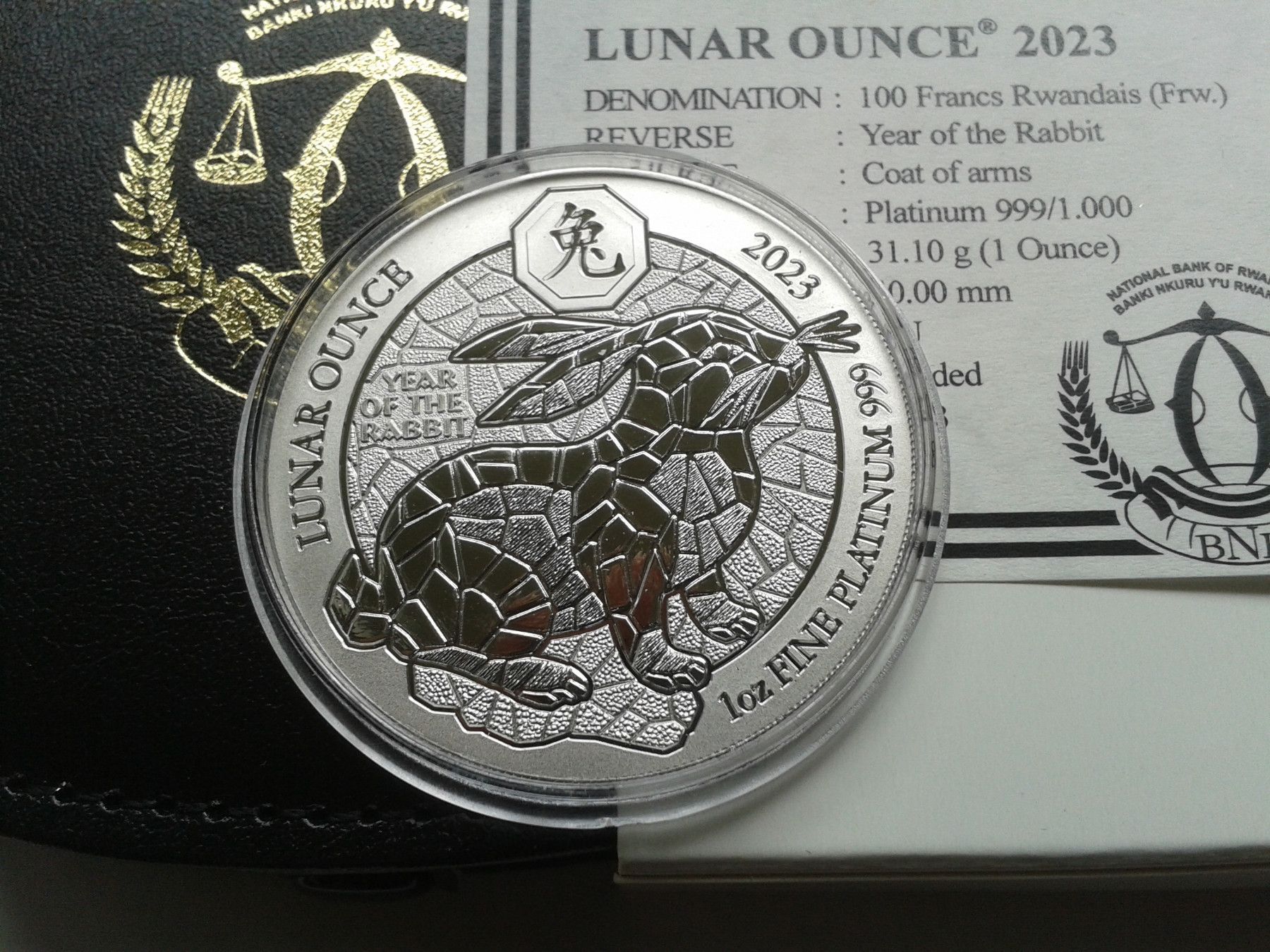 100 Francs 2023 Ruanda Lunar Hase 1 Unze Platin 31,1g 999er Platin - nur 88 Stück geprägt, In Etui, mit Zertifikat und Umverpackung. bei Fragen: