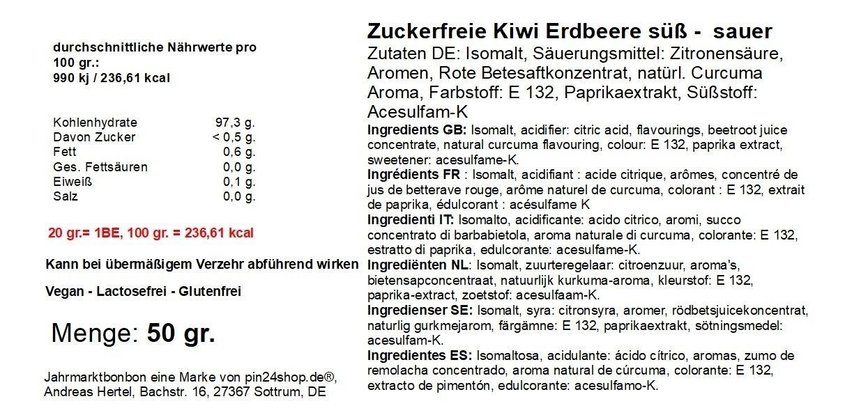 100 gr. Zuckerfreie Kiwi Erdbeere süss sauer nur von Jahrmarktbonbon