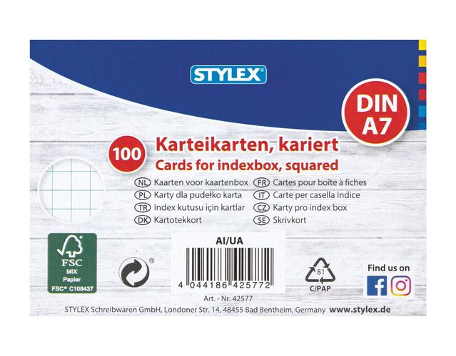Karteikarten Format: DIN A7 Farbe: weiss Grammatur: 140g/m² kariert