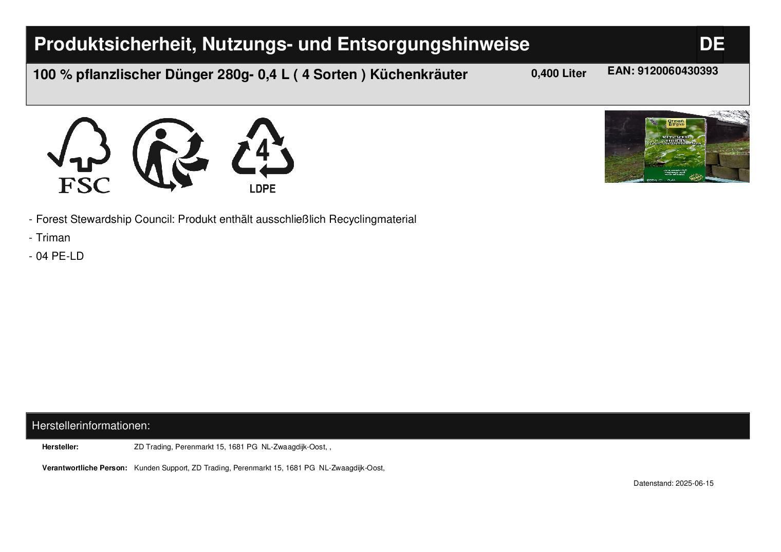 100 % pflanzlischer Dünger 280g 0,4L Küchenkräuter