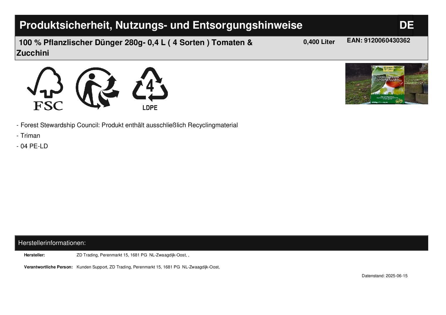 100 % Pflanzlischer Dünger 280g 0,4L Tomaten & Zucchini