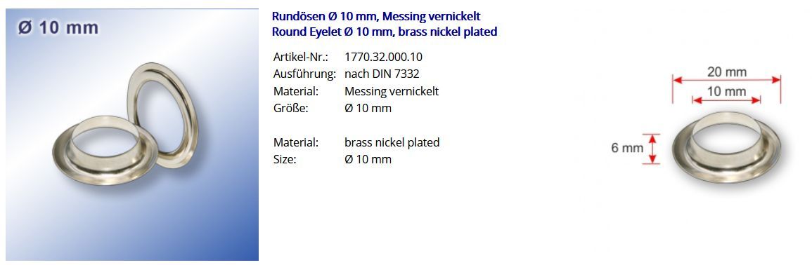 Rundösen Round eyelets Durchschitt 10 mm, brass nickel plated Artikel-Nr.: 1770.32.000.10 Ausführung: nach DIN 7332 Material: Messing vernickelt Größe: Durchschitt 10 mm Menge: 100 Stück Rundösen + 100 Stück Gegenscheiben Passende Werkzeuge und Hilfsmittel zur professionellen Verarbeitung von Rundös