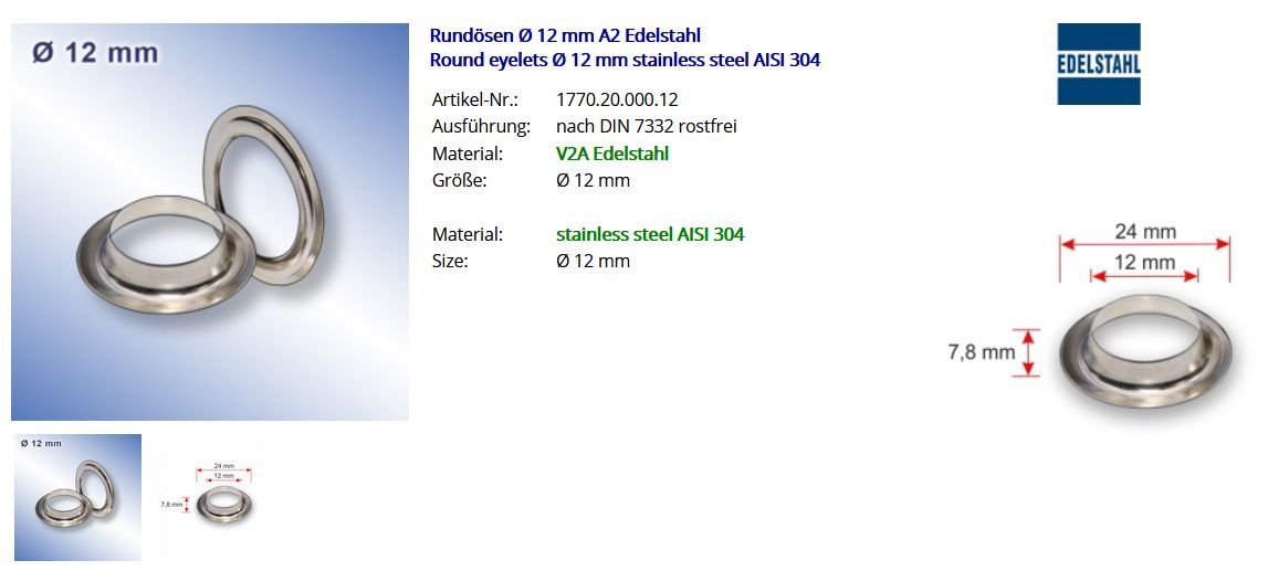 Rundösen INOX Round eyelets Durchschitt 12 mm, stainless steel AISI 304 Artikel-Nr.: 1770.20.000.12 Ausführung: nach DIN 7332 rostfrei Material: A2 Edelstahl Größe: Durchschitt 12 mm Menge: 100 Stück Rundösen + 100 Stück Gegenscheiben Passende Werkzeuge und Hilfsmittel zur professionellen Verarbeitu