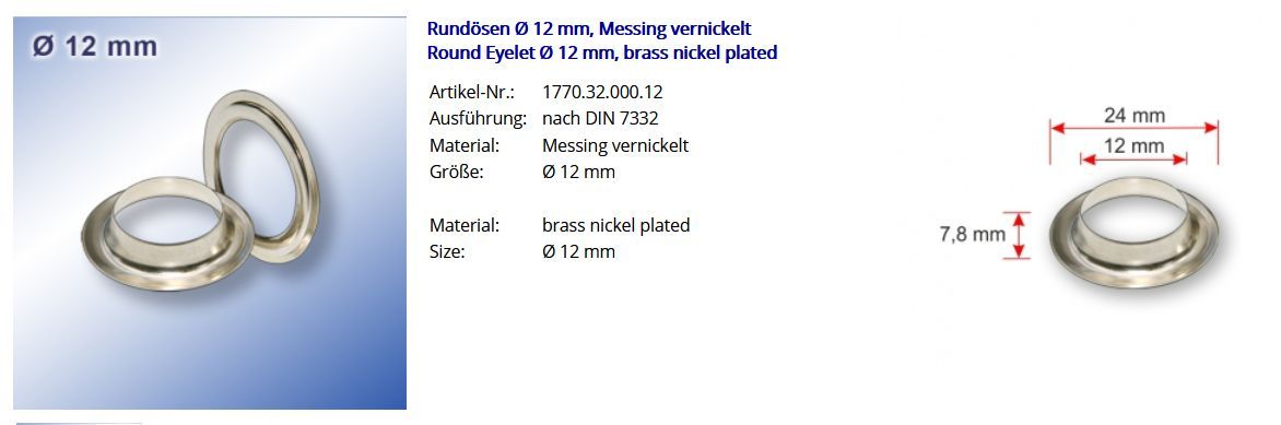 Rundösen Round eyelets Durchschitt 12 mm, brass nickel plated Artikel-Nr.: 1770.32.000.12 Ausführung: nach DIN 7332 Material: Messing vernickelt Größe: Durchschitt 12 mm Menge: 100 Stück Rundösen + 100 Stück Gegenscheiben Passende Werkzeuge und Hilfsmittel zur professionellen Verarbeitung von Rundös