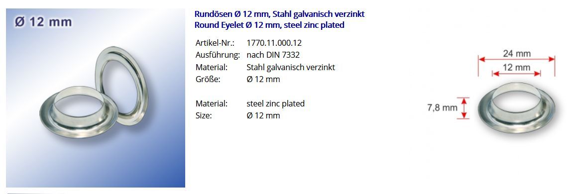 Rundösen Round Eyelet Durchschitt 12 mm, steel zinc plated Artikel-Nr.: 1770.11.000.12 Ausführung: nach DIN 7332 Material: Stahl galvanisch verzinkt Größe: Durchschitt 12 mm Menge: 100 Stück Rundösen + 100 Stück Gegenscheiben Passende Werkzeuge und Hilfsmittel zur professionellen Verarbeitung von Ru