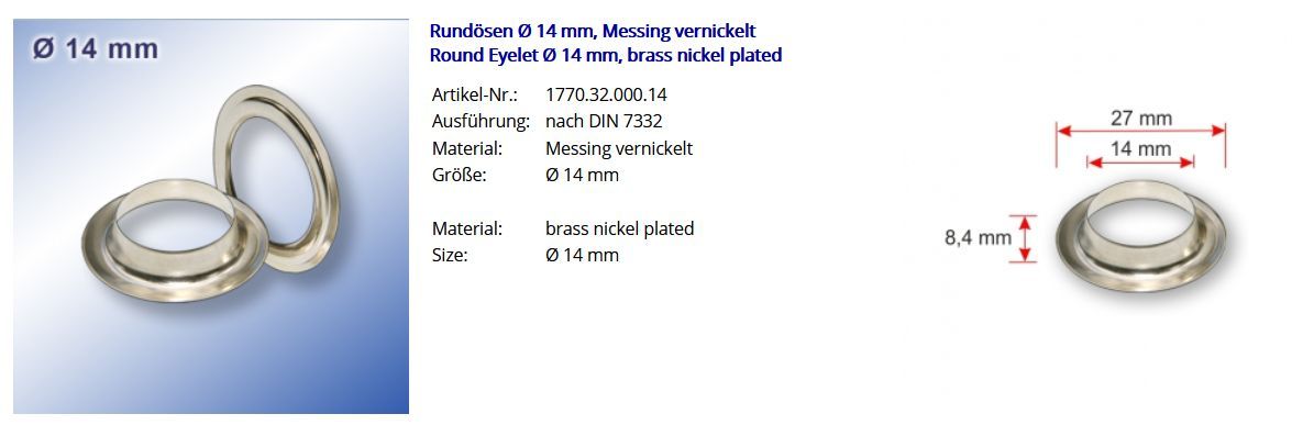 Rundösen Round eyelets Durchschitt 14 mm, brass nickel plated Artikel-Nr.: 1770.32.000.14 Ausführung: nach DIN 7332 Material: Messing vernickelt Größe: Durchschitt 14 mm Menge: 100 Stück Rundösen + 100 Stück Gegenscheiben Passende Werkzeuge und Hilfsmittel zur professionellen Verarbeitung von Rundös
