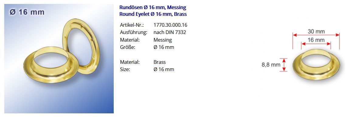 Rundösen Round eyelets Durchschitt 16 mm, brass Artikel-Nr.: 1770.30.000.16 Ausführung: nach DIN 7332 Material: Messing Größe: Durchschitt 16 mm Menge: 100 Stück Rundösen + 100 Stück Gegenscheiben Passende Werkzeuge und Hilfsmittel zur professionellen Verarbeitung von Rundösen: Henkellocheisen Einsc