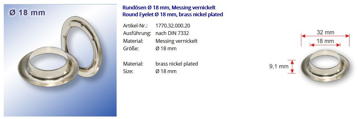 Rundösen Round eyelets Durchschitt 18 mm, brass nickel plated Artikel-Nr.: 1770.32.000.18 Ausführung: nach DIN 7332 Material: Messing vernickelt Größe: Durchschitt 18 mm Menge: 100 Stück Rundösen + 100 Stück Gegenscheiben Passende Werkzeuge und Hilfsmittel zur professionellen Verarbeitung von Rundös