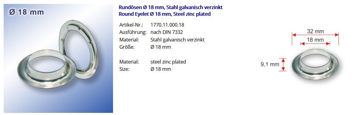 Rundösen Round Eyelet Durchschitt 18 mm, steel zinc plated Artikel-Nr.: 1770.11.000.18 Ausführung: nach DIN 7332 Material: Stahl galvanisch verzinkt Größe: Durchschitt 18 mm Menge: 100 Stück Rundösen + 100 Stück Gegenscheiben Passende Werkzeuge und Hilfsmittel zur professionellen Verarbeitung von Ru