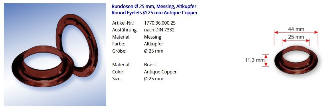 Rundösen Round Eyelet Durchschitt 25 mm, brass Artikel-Nr.: 1770.37.000.25 Ausführung: nach DIN 7332 Material: Messing altkupfer Größe: Durchschitt 25 mm Menge: 100 Stück Rundösen + 100 Stück Gegenscheiben Passende Werkzeuge und Hilfsmittel zur professionellen Verarbeitung von Rundösen: Henkellochei