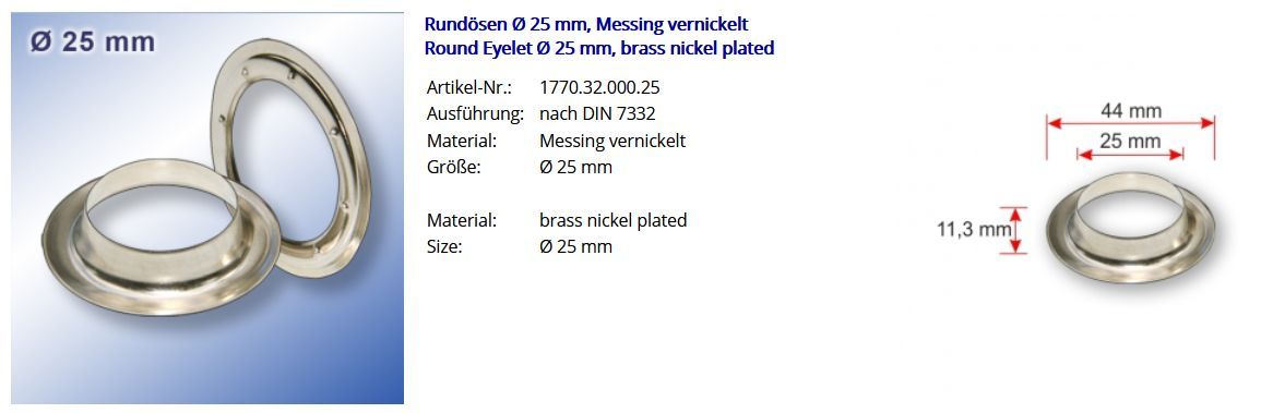 Rundösen Round eyelets Durchschitt 25 mm, brass nickel plated Artikel-Nr.: 1770.32.000.25 Ausführung: nach DIN 7332 Material: Messing vernickelt Größe: Durchschitt 25 mm Menge: 100 Stück Rundösen + 100 Stück Gegenscheiben Passende Werkzeuge und Hilfsmittel zur professionellen Verarbeitung von Rundös