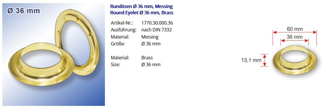 Rundösen Round eyelets Durchschitt 36 mm, brass Artikel-Nr.: 1770.30.000.36 Ausführung: nach DIN 7332 Material: Messing Größe: Durchschitt 36 mm Menge: 100 Stück Rundösen + 100 Stück Gegenscheiben Passende Werkzeuge und Hilfsmittel zur professionellen Verarbeitung von Rundösen: Henkellocheisen Einsc