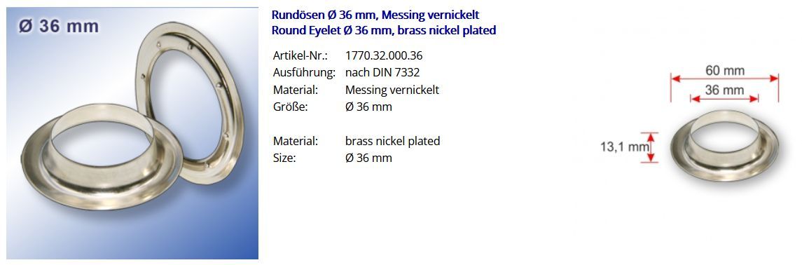 Rundösen Round eyelets Durchschitt 36 mm, brass nickel plated Artikel-Nr.: 1770.32.000.36 Ausführung: nach DIN 7332 Material: Messing vernickelt Größe: Durchschitt 36 mm Menge: 100 Stück Rundösen + 100 Stück Gegenscheiben Passende Werkzeuge und Hilfsmittel zur professionellen Verarbeitung von Rundös