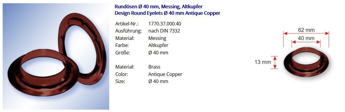 Rundösen Round Eyelet Durchschitt 40 mm, brass Artikel-Nr.: 1770.37.000.40 Ausführung: nach DIN 7332 Material: Messing altkupfer Größe: Durchschitt 40 mm Menge: 100 Stück Rundösen + 100 Stück Gegenscheiben Passende Werkzeuge und Hilfsmittel zur professionellen Verarbeitung von Rundösen: Henkellochei