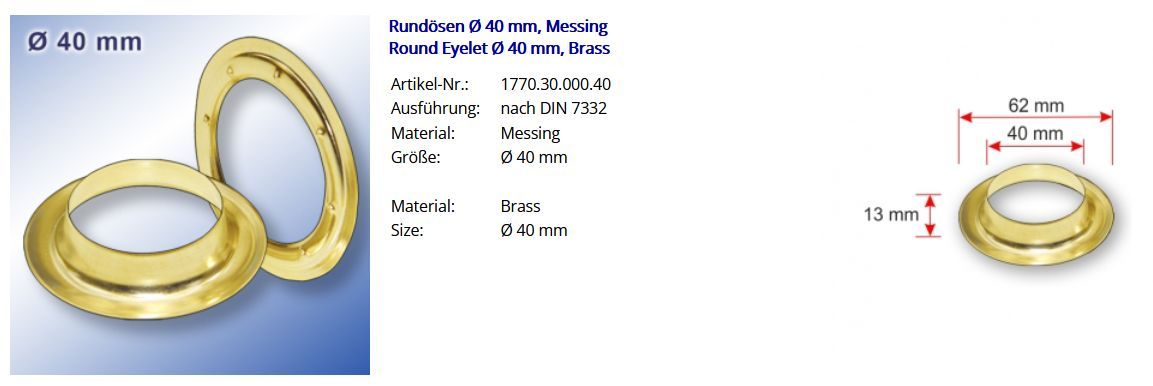 Rundösen Round eyelets Durchschitt 40 mm, brass Artikel-Nr.: 1770.30.000.40 Ausführung: nach DIN 7332 Material: Messing Größe: Durchschitt 40 mm Menge: 100 Stück Rundösen + 100 Stück Gegenscheiben Passende Werkzeuge und Hilfsmittel zur professionellen Verarbeitung von Rundösen: Henkellocheisen Einsc