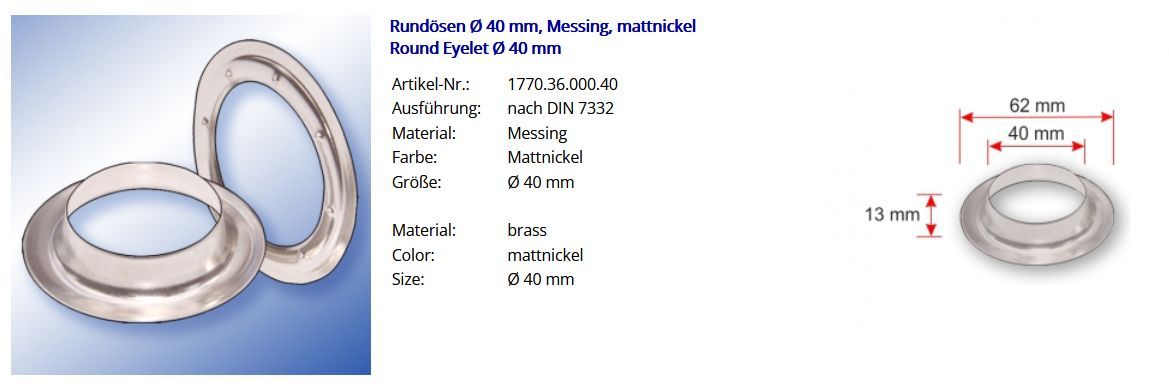 Round Eyelet Durchschitt 40 mm, brass nickel Artikel-Nr.: 1770.36.000.40 Ausführung: nach DIN 7332 Material: Messing mattnickel Größe: Durchschitt 40 mm Menge: 100 Stück Rundösen + 100 Stück Gegenscheiben Passende Werkzeuge und Hilfsmittel zur professionellen Verarbeitung von Rundösen: Henkellocheis