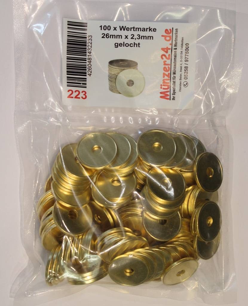 100 x Parkmarke, Parkmünze 26mm x 2,3mm, Parkmünzen mit Loch, Messing Wertmarke