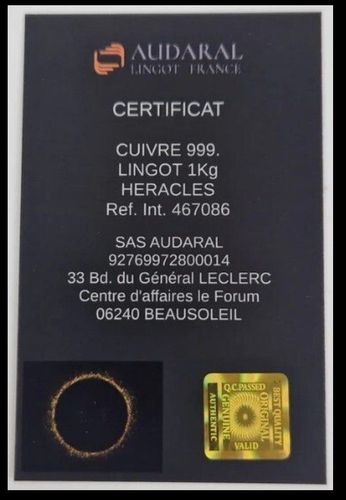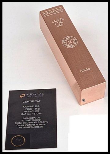 1000g Kupfer Barren 1 Kg Riegel höchster Qualität 999 Heracles Frankreich Zertifikat