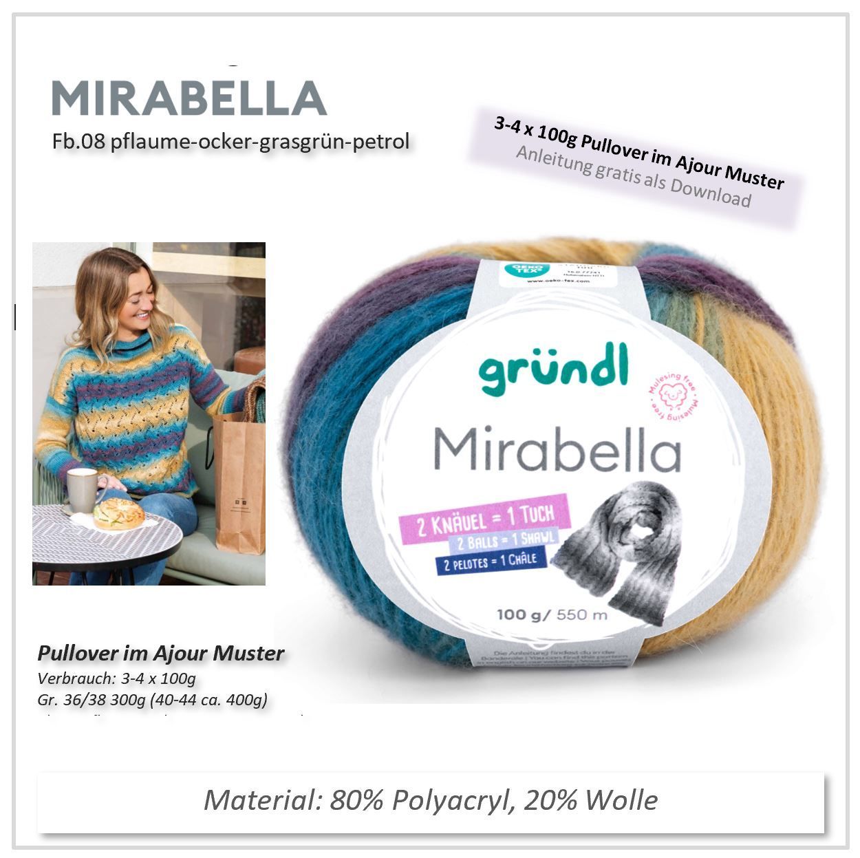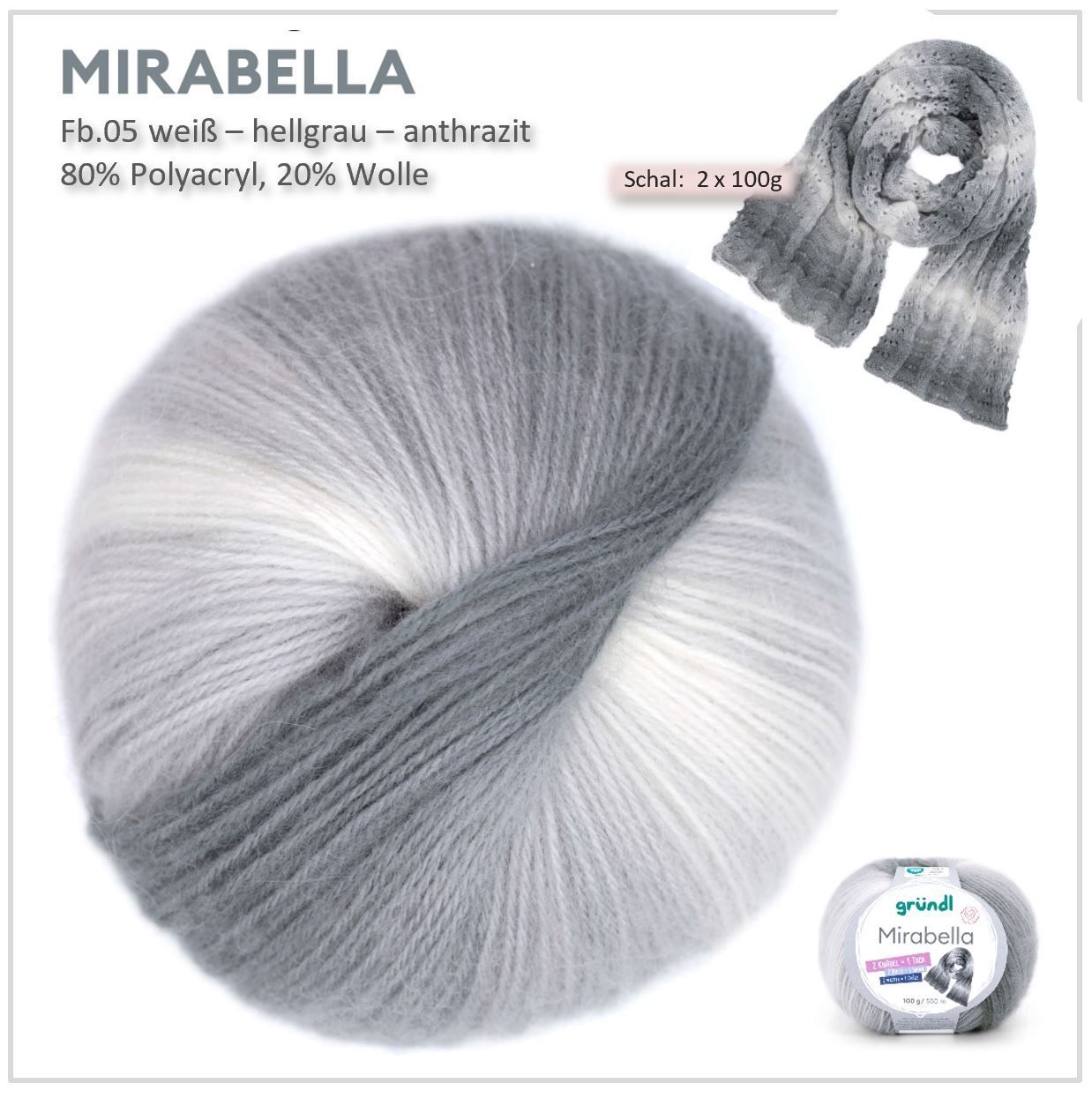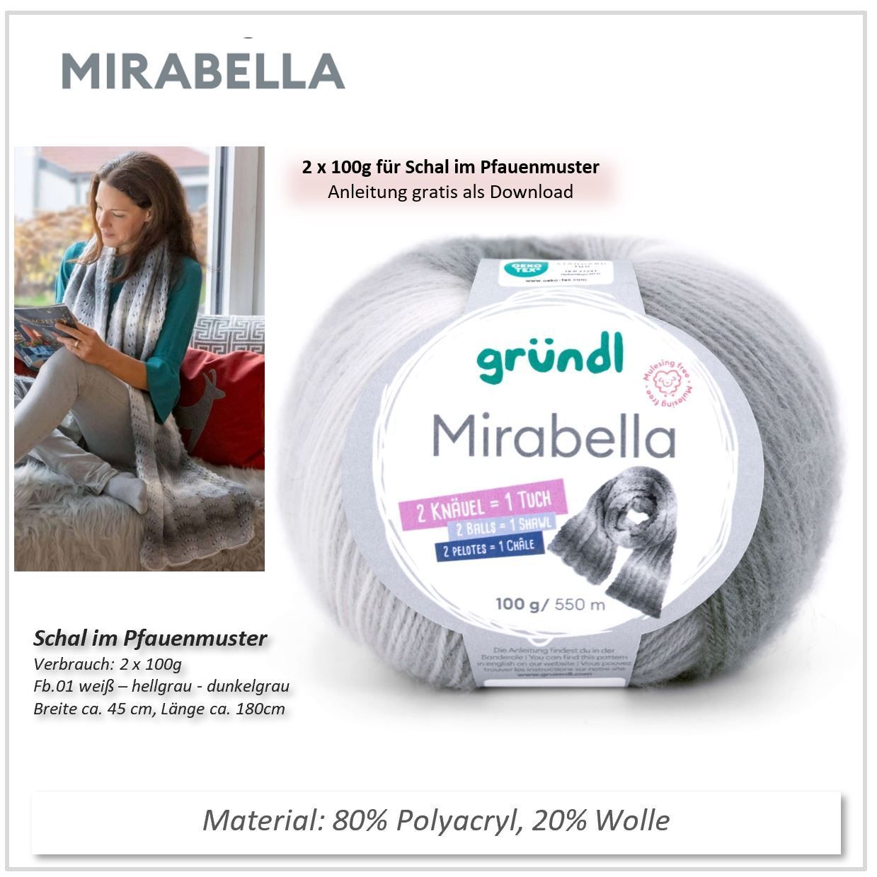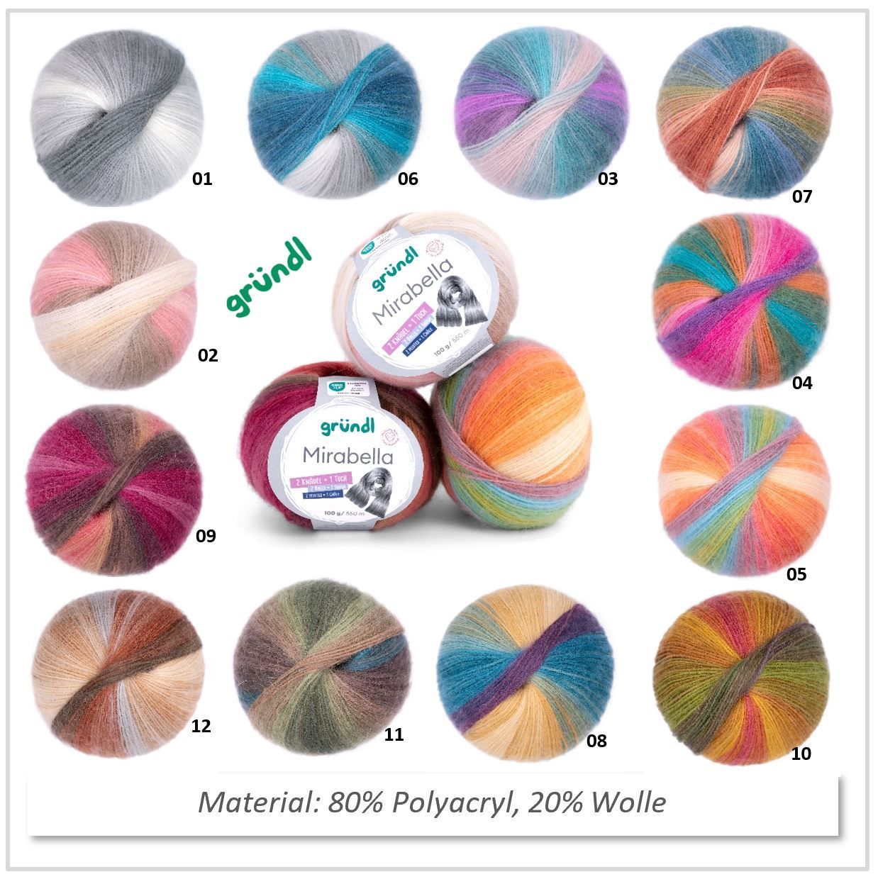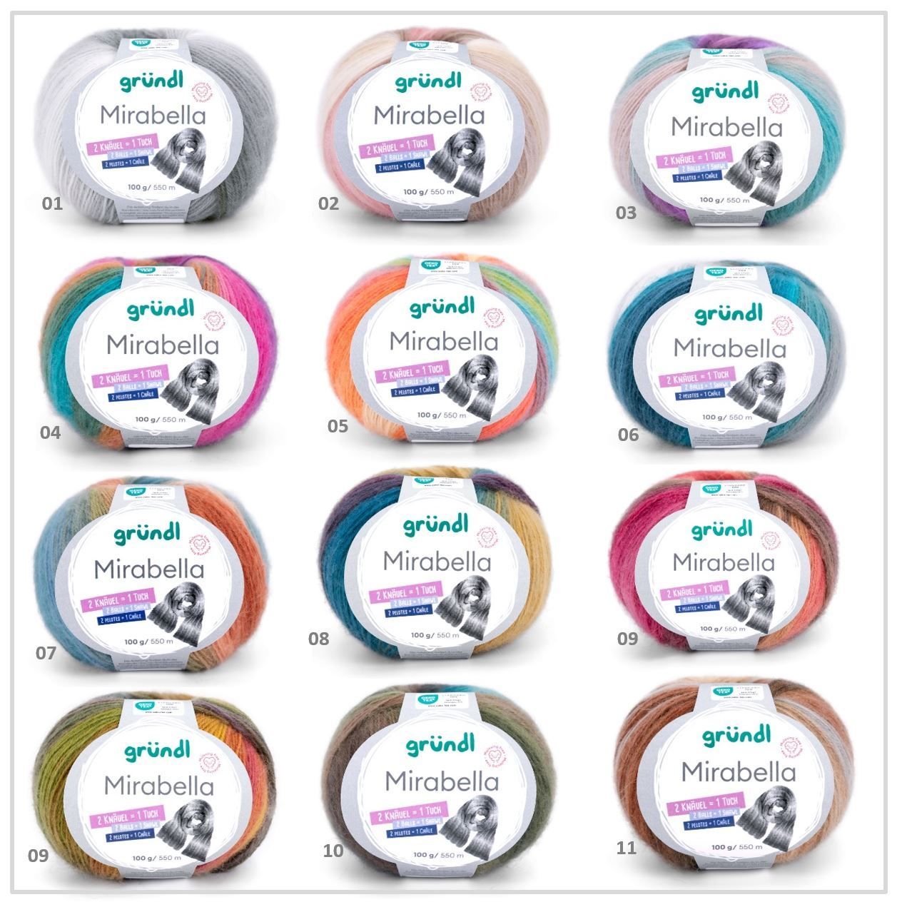 Ich habe aus der Farbe 01 (weiß - grau) mit 2 Knäulen einen wunderschönen langen Schal gestickt. Aus der Farbe 02 (rose-hellbraun) habe ich mit nur einem Knäuel einen schönen Loop gehäkelt. Tolle Qualität - lässt sich sehr gut verarbeiten - bleibt beim Waschen formstabil. Ein Knäuel sind 100g - reicht auch für 2 kleine Hals- bzw. Dreieckstücher. Sehr kuschlig und kann ich sehr empfehlen.