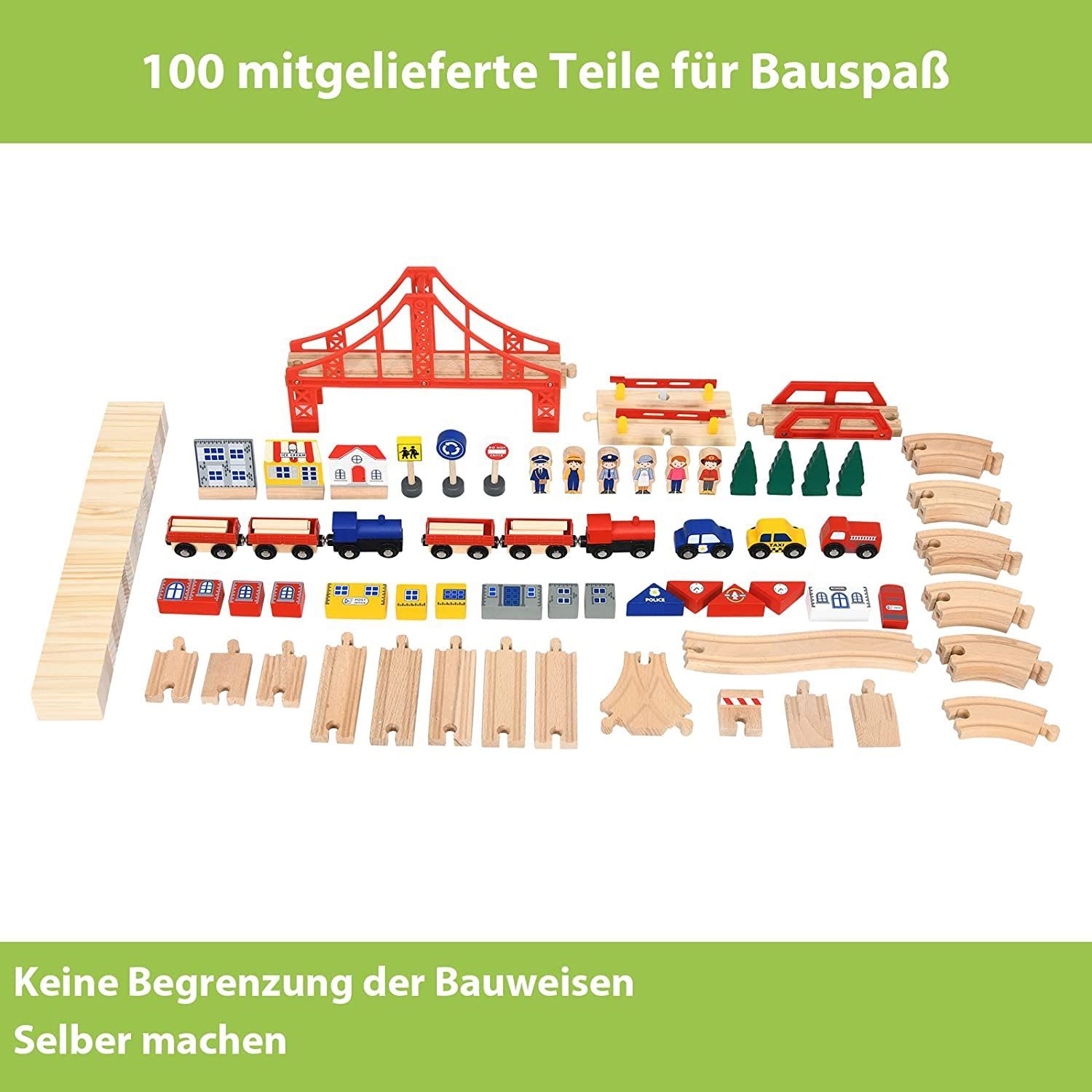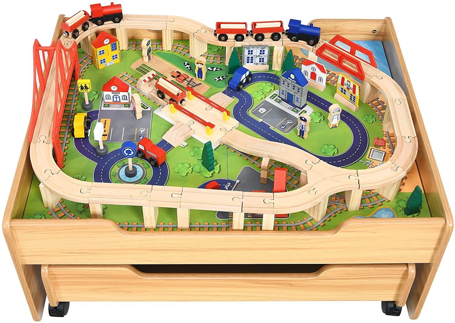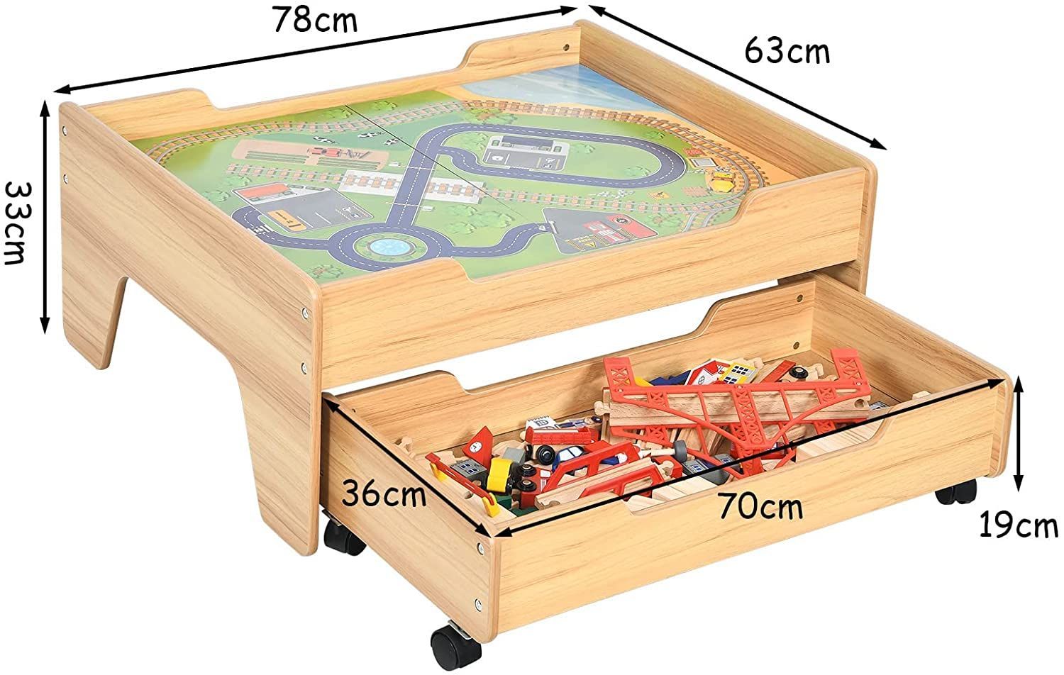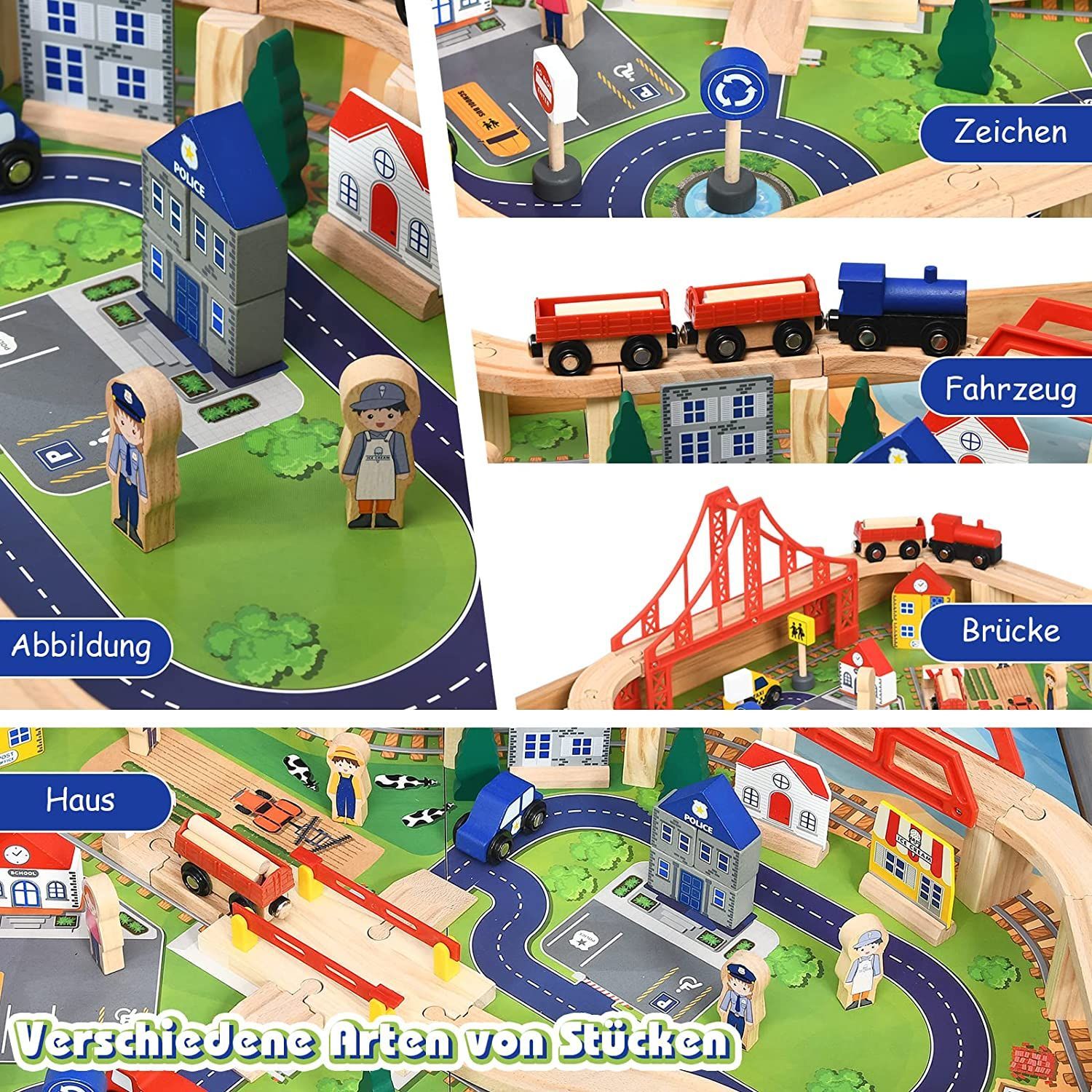 100tlg. Hölzerne Kindereisenbahn Kinder Spieltisch mit Schublade&Rädern Holzeisenbahn
