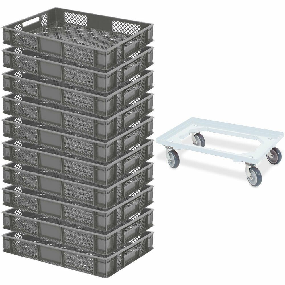 10x Bäckerkiste / Euroboxen, LxBxH 600x400x90 mm, grau + Transportroller