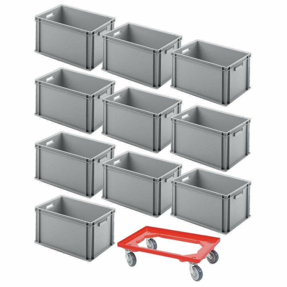 10x Eurobehälter, LxBxH 600 x 400 x 320 mm, grau + 1 GRATIS Transportroller