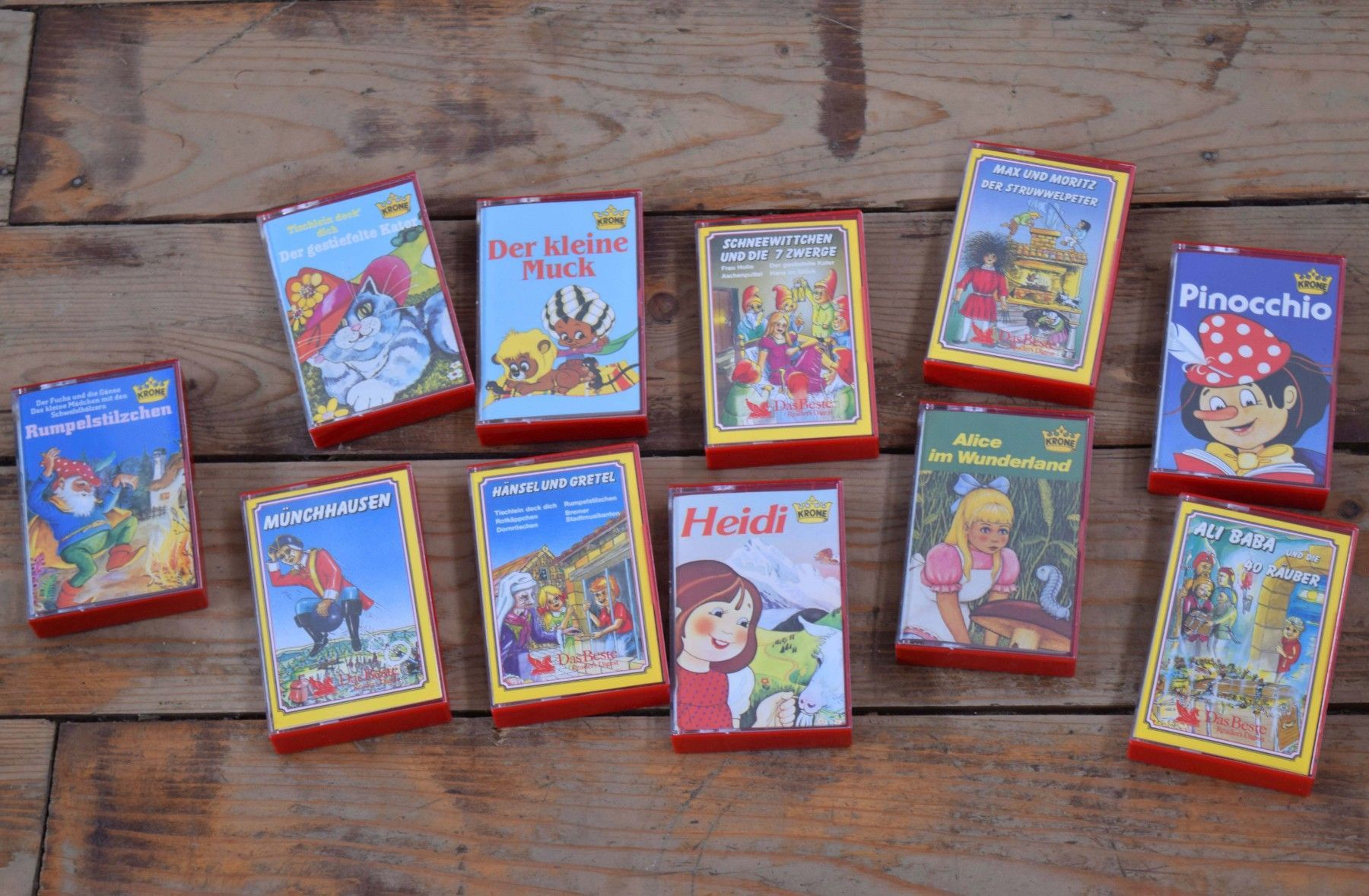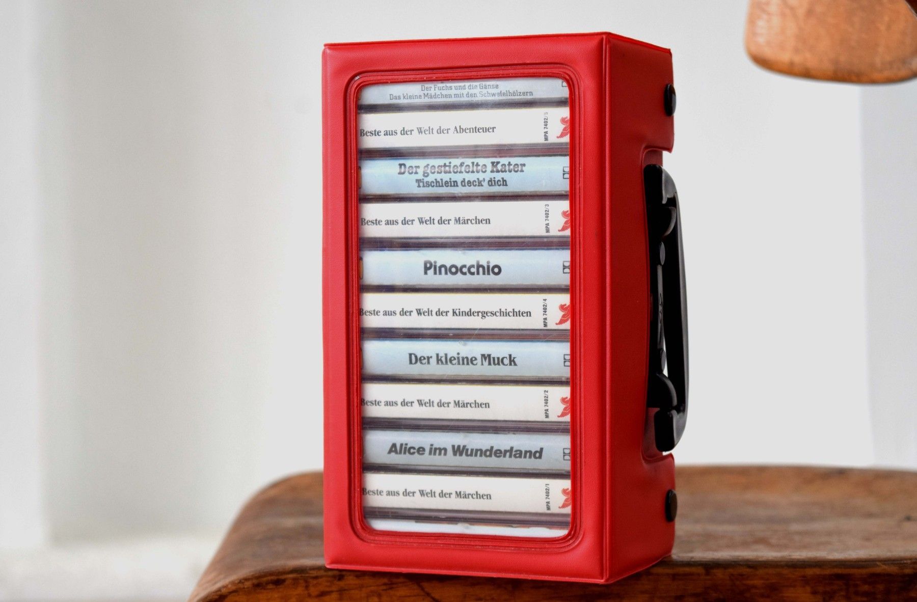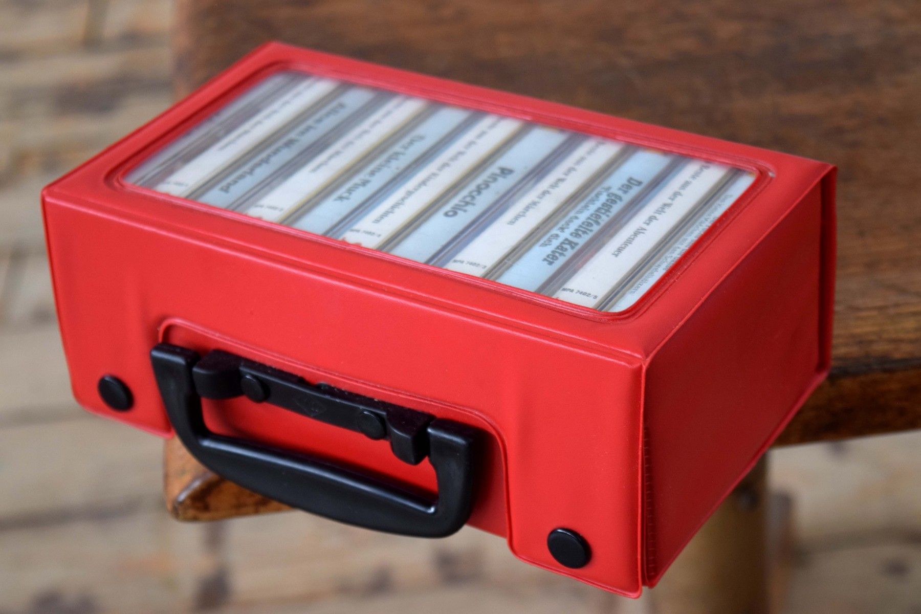 11 Kassetten in Kassettenkoffer Märchen Kasettenbox Auto Rot Schwarz mit Sichtfenster