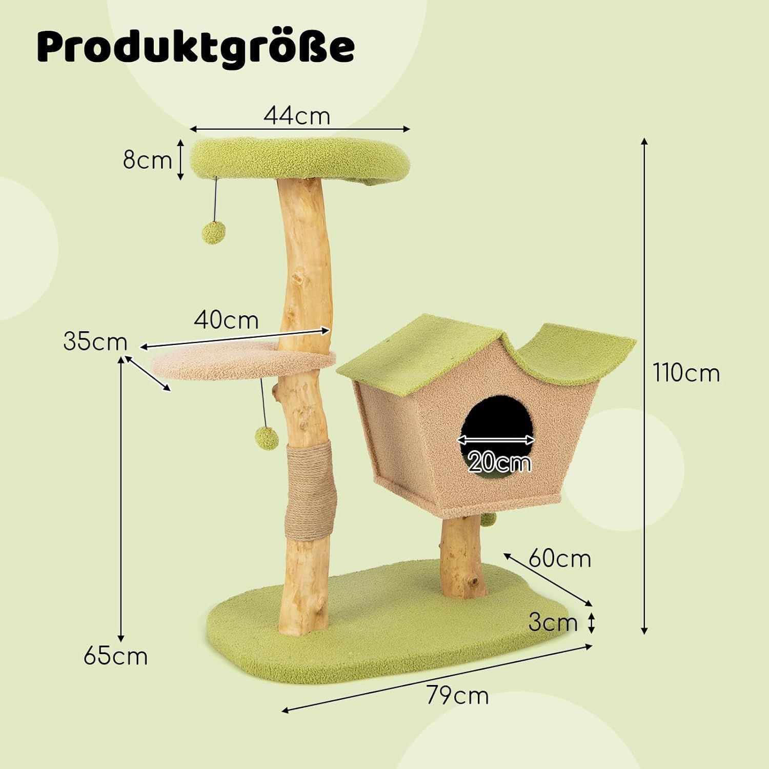 110 cm Kratzbaum Holz, Katzenbaum mit Sitzfläche & Katzenhaus & Ball, Katzenturm