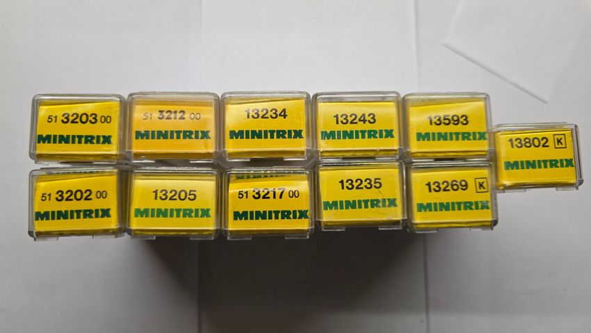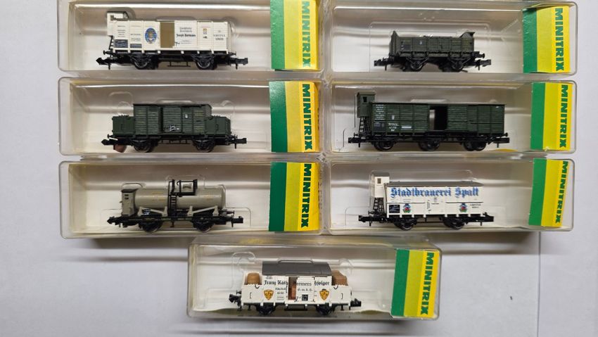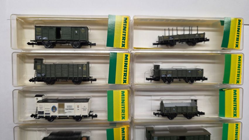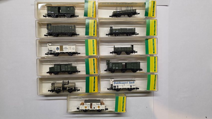 11x Minitrix. Güterwagen 2-achsig .Bay.Sts.B, Epoche I, OVP , 1x Minitrix 13202 Gedeckter Güterwagen 1x Minitrix 13203 Offener Güterwagen 1x Minitrix 13205 Brot-Transportwagen Fa. Bartmann Landshut 1x Minitrix 13212 Colonialwaren-Wagen 1x Minitrix 13217 Kesselwagen 1x Minitrix 13234 Niederbordwagen