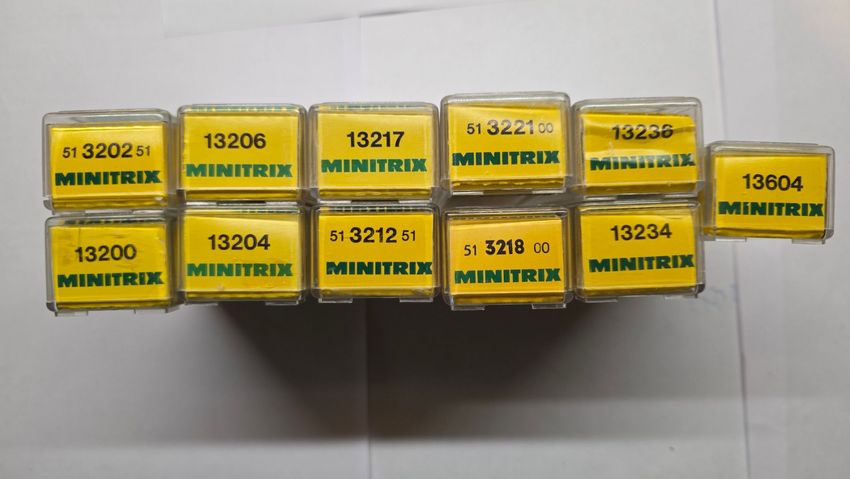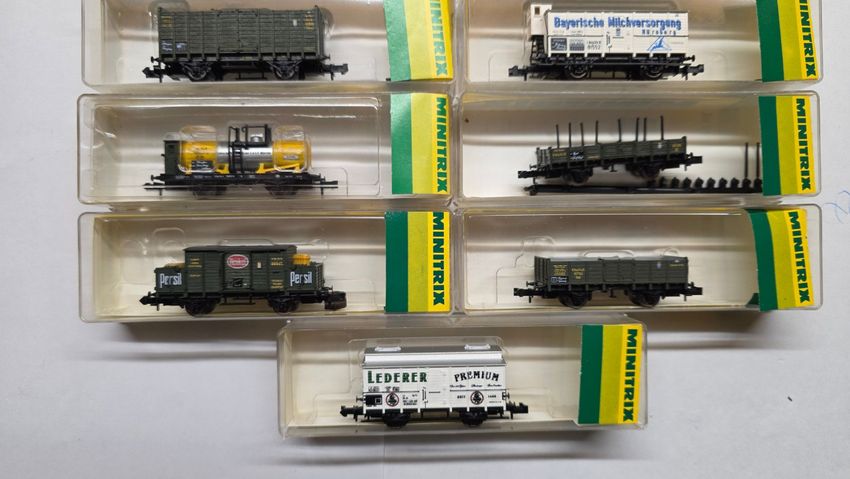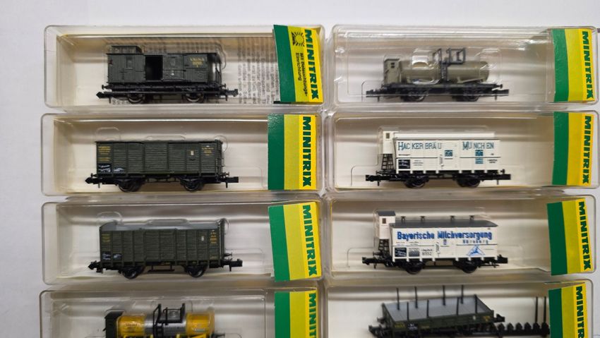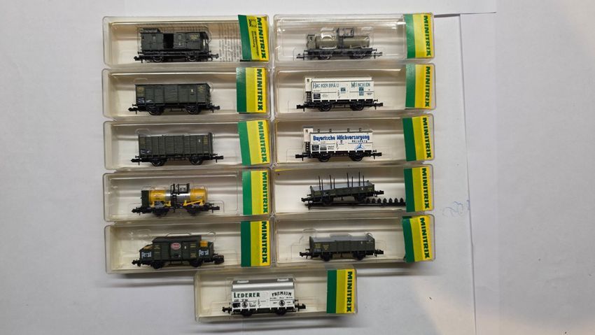 11x Minitrix. Güterwagen 2-achsig .Bay.Sts.B, Epoche I, OVP , 1x Minitrix 13200 Packwagen mit Schlussbeleuchtung 1x Minitrix 13202 Gedeckter Güterwagen 1x Minitrix 13204 Offener Güterwagen 1x Minitrix 13206 Kesselwagen Chem. Werke München 1x Minitrix 13212 (13611) Old-Timer Spezialwagen Persil 1x Mi