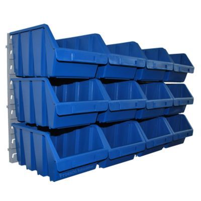 Große blaue Sichtlagerkisten mit Wandhalter. Die 12 Boxen können ineinander oder auch übereinander gestapelt werden.