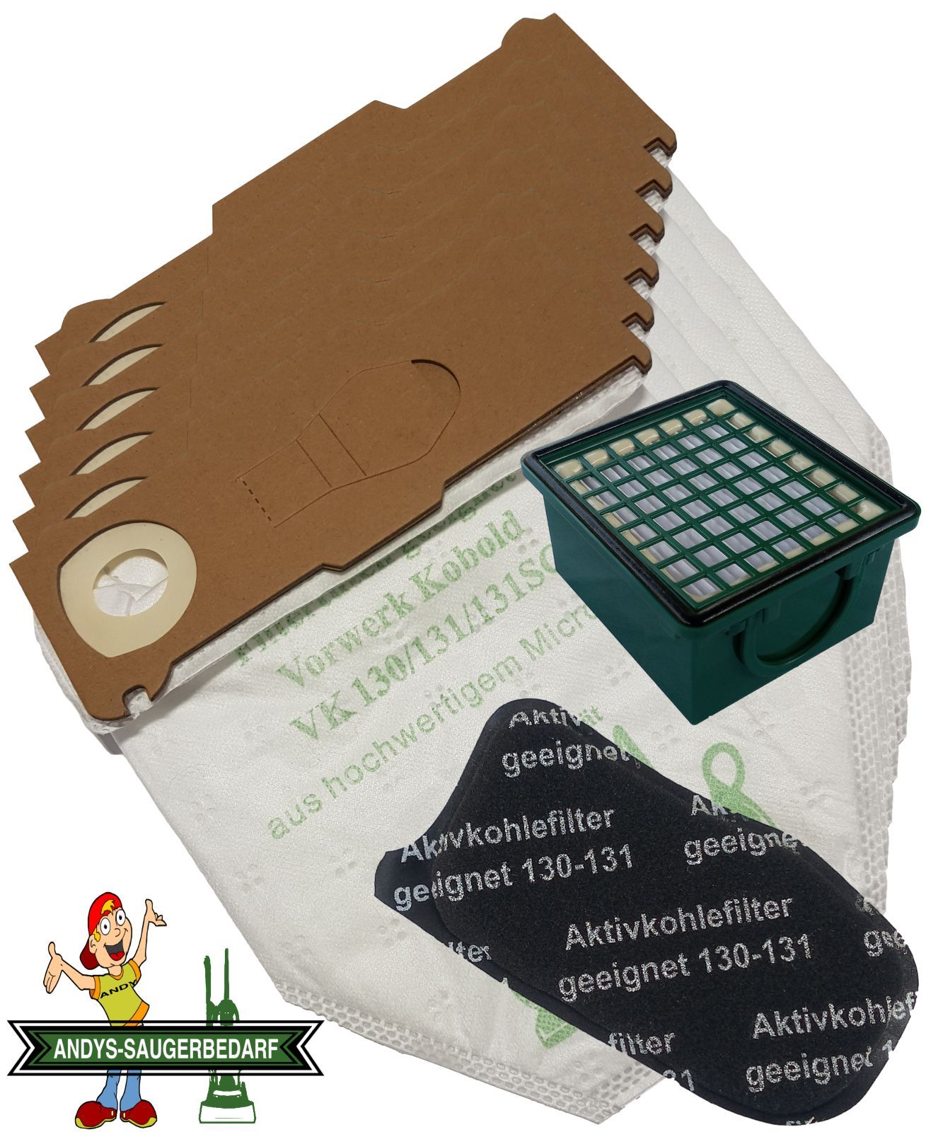 Andys-Saugerbedarf 12 Filtertüten Beutel Vlies geeignet Vorwerk Kobold VK 130 131 + Filter Set Artikelbeschreibung Sie erwerben 12 Staubsaugerbeutel. 4 lagiges Microvlies. Allergiker geeignet. Stabile Deckscheibe. Mit Staubverschluss. Im Polybeutel. + 1 Hygiene Abluftfilter. + 1 Motorschutz Geruchsf