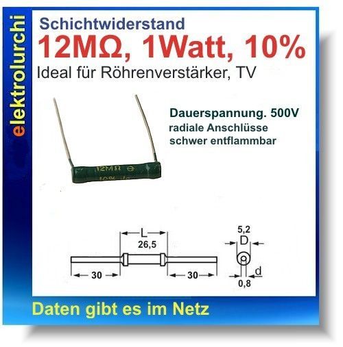 Sie bieten hier auf folgenden Artikel 2 Stück 12 MOhm 12M Ohm, 1Watt, 10% Schichtwiderstand, Lastwiderstand auf Keramikkörper, ideal für Vintage Röhrenverstärker, Empfänger ect. Typ: Schichtwiderstand Widerstand: 12M Ohm Nennlast: 1,0 Watt Nennspannung: 500Volt Toleranz: 10% Bauform: radiale Lötansc