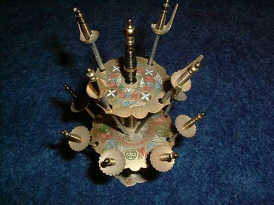 Biete in dieser Auktion an: schöner alter Ständer mit 12 Spießen aus Metall Material Messing, farbig verziert Spieße tragen die Aufschrift Toledo 10cm hoch und 8 cm breit aus Privathaushalt einer älteren Dame, Artikel war im Gebrauch, aber noch gut erhalten. . Da ich viele weitere Artikel im Angebot