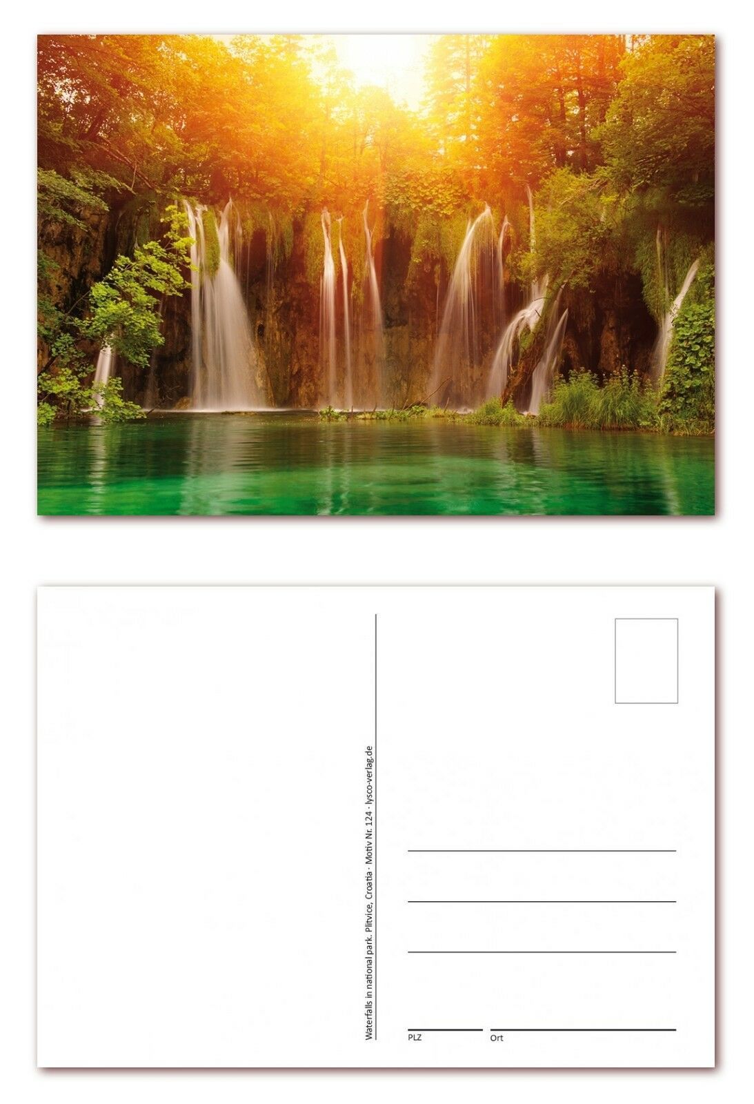 12 Stück Postkarten DIN A6 mit Wasserfall und Waldsee im Sonnenschein (PKT-124)