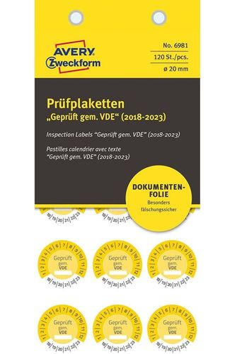 Avery Zweckform 120x Prüfplaketten Geprüft gem. VDE 2018-2023 20mm Gelb Folie